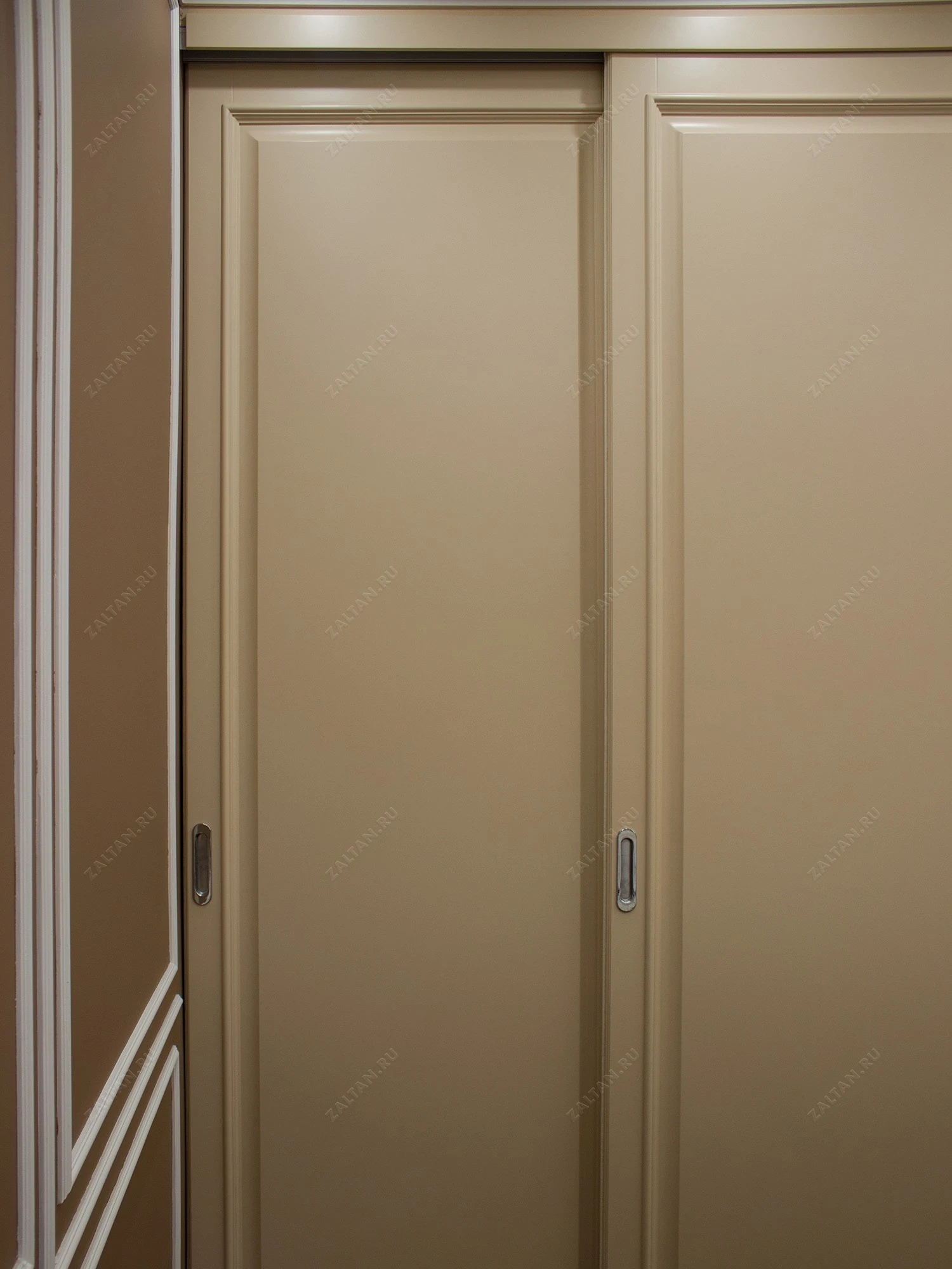 Классический дизайн шкафа подчеркивается молдингами на дверцах и нейтральным цветом, благодаря чему он идеально вписывается в спальное пространство, добавляя ему изысканности и утонченности. Безпрофильная система купе с усиленными роликами и врезными натяжителями обеспечивает легкость и бесшумность передвижения дверей.