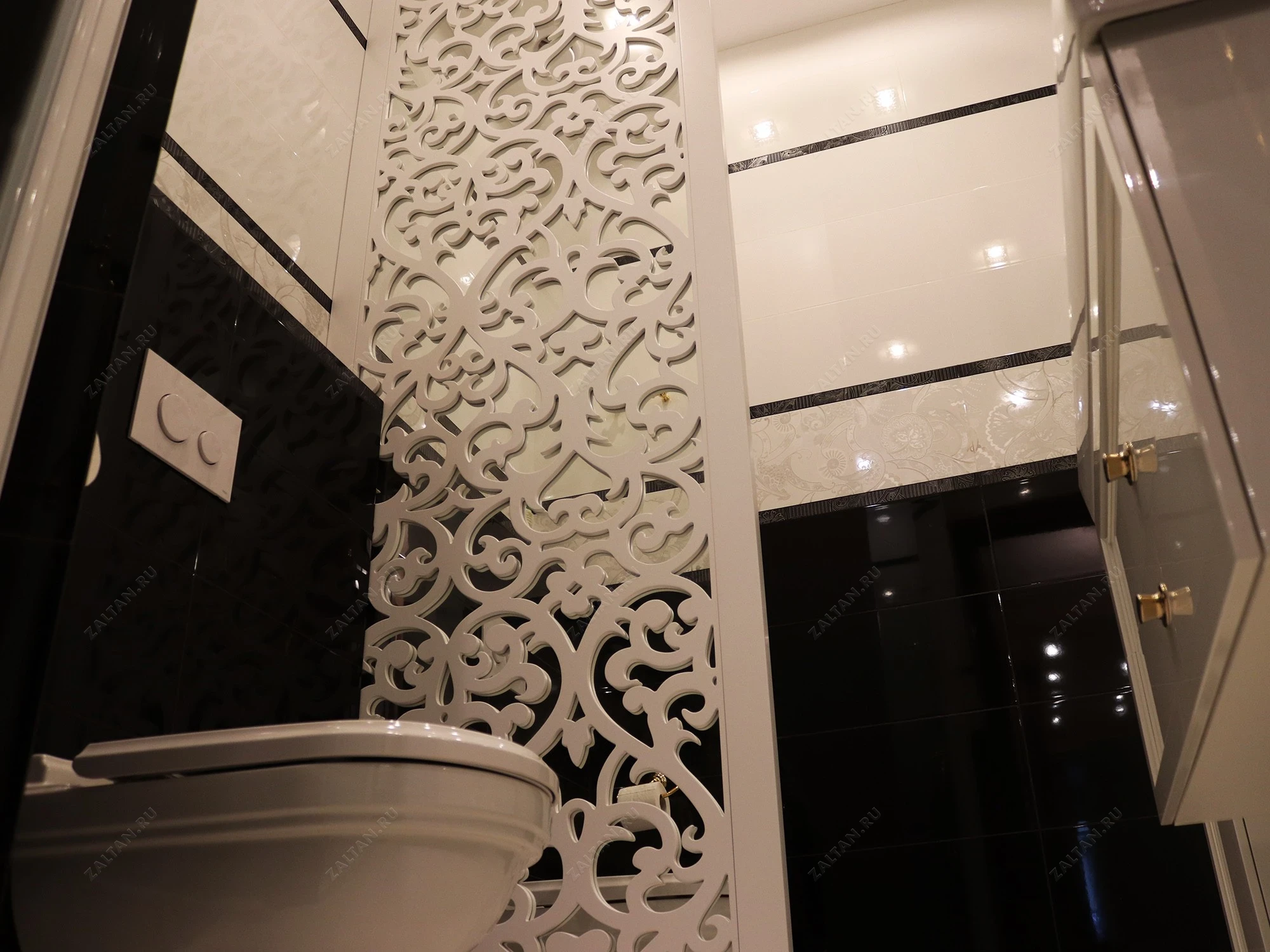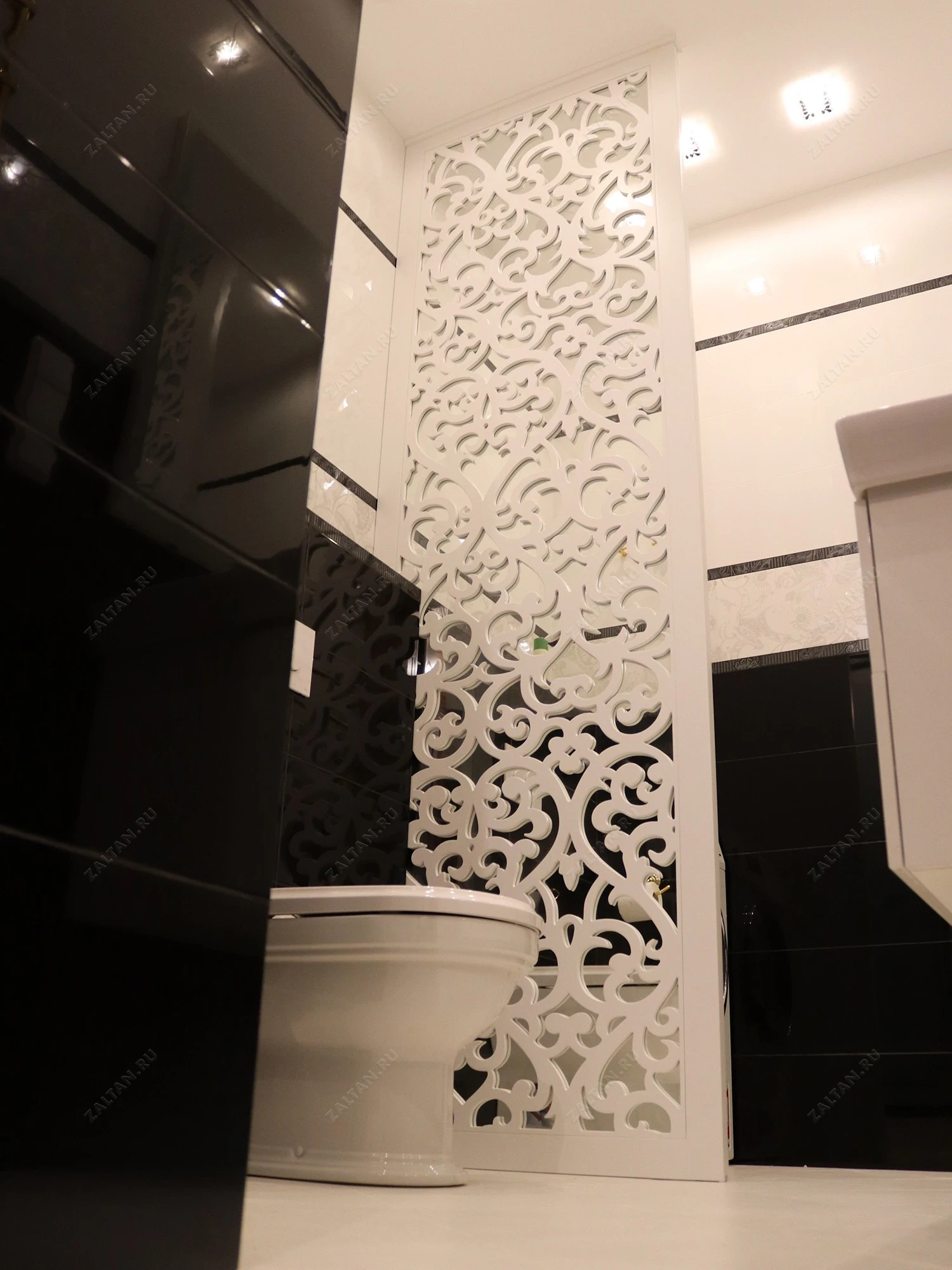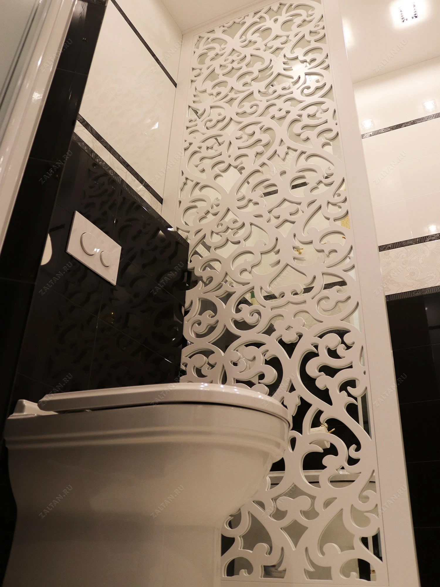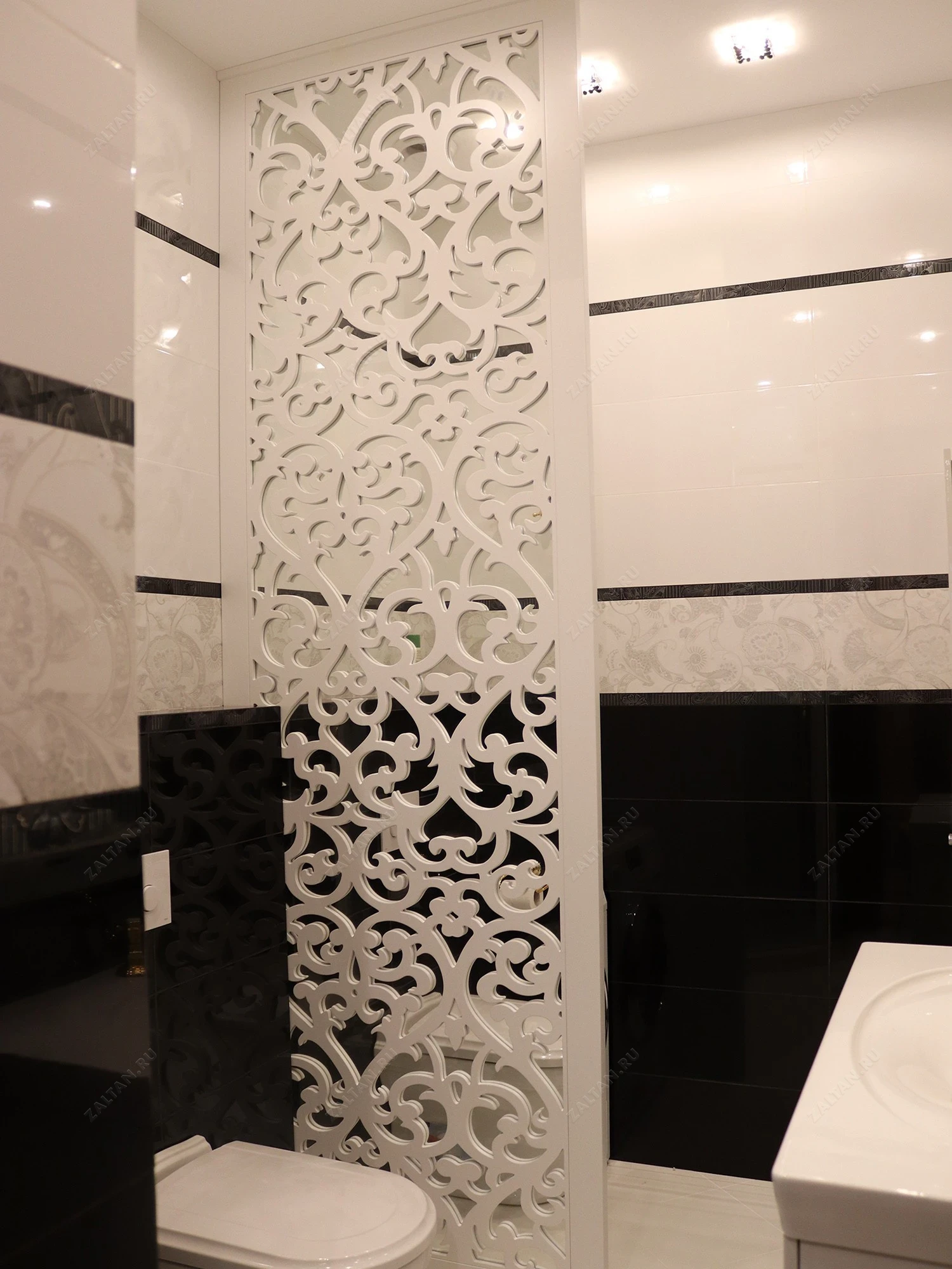 Декоративная зеркальная перегородка Брокет от компании ZALTAN – с уникальной ЧПУ фрезеровкой из крашеного МДФ не только зонирует пространство ванной комнаты или санузла, но и служит эффектным декоративным элементом. Сложный узор фрезеровки создаёт игру света и тени, добавляя интерьеру глубину и изысканность.