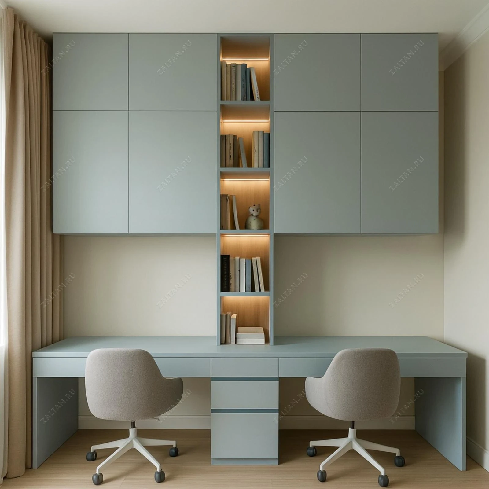 Компактная премиальная рабочая зона на двоих — встроенный стол с подвесными шкафами и центральным стеллажом с подсветкой. Чёткие прямые линии, матовые фасады и скрытая фурнитура обеспечивают сдержанный современный вид.