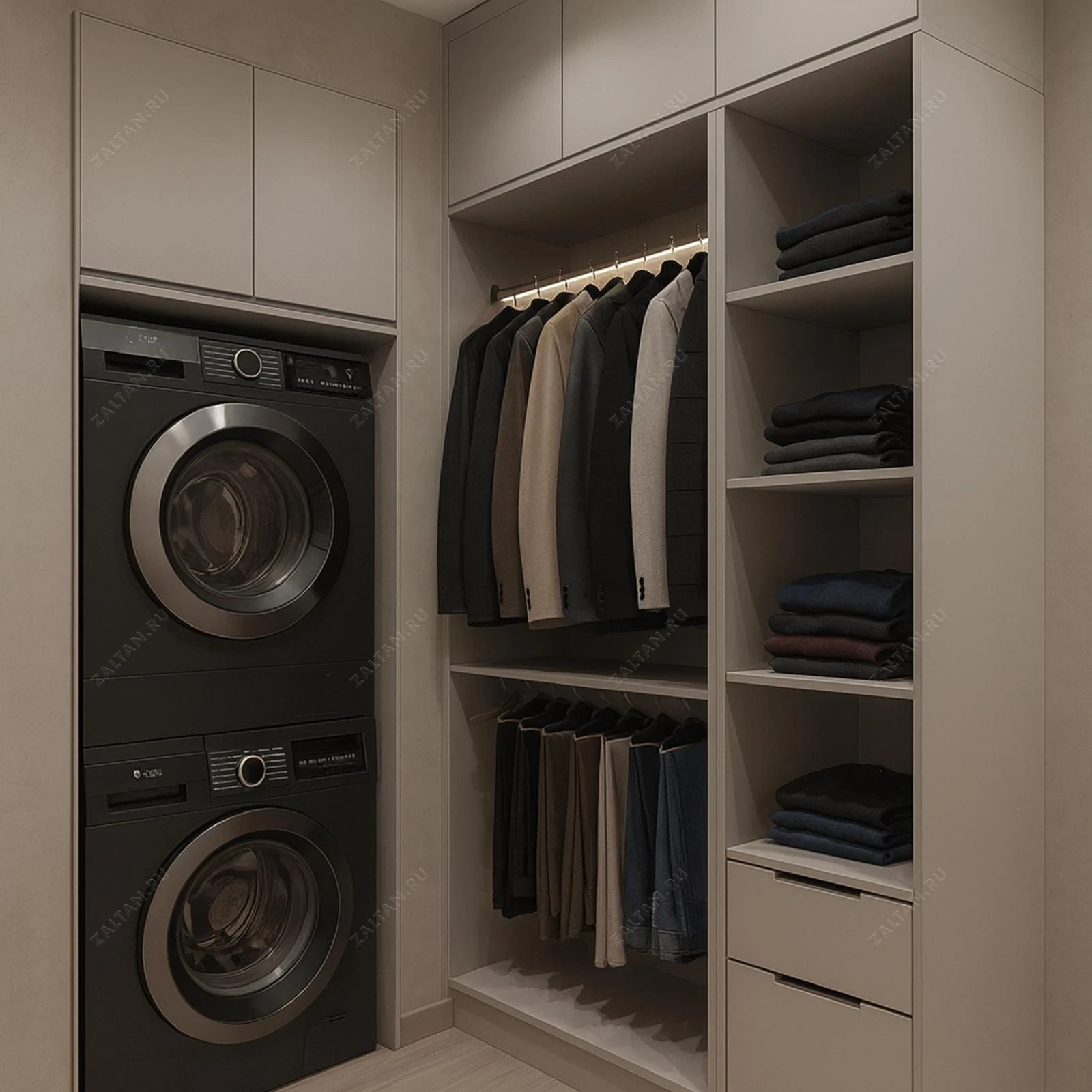 Встроенная гардеробная с выделенной нишей для стиральной и сушильной машин — решение для компактных квартир, сочетающее хранение и постирочную зону. Продуманная планировка: двухуровневая штанга для верхней одежды, нижняя штанга для брюк, открытые полки и выдвижные ящики.