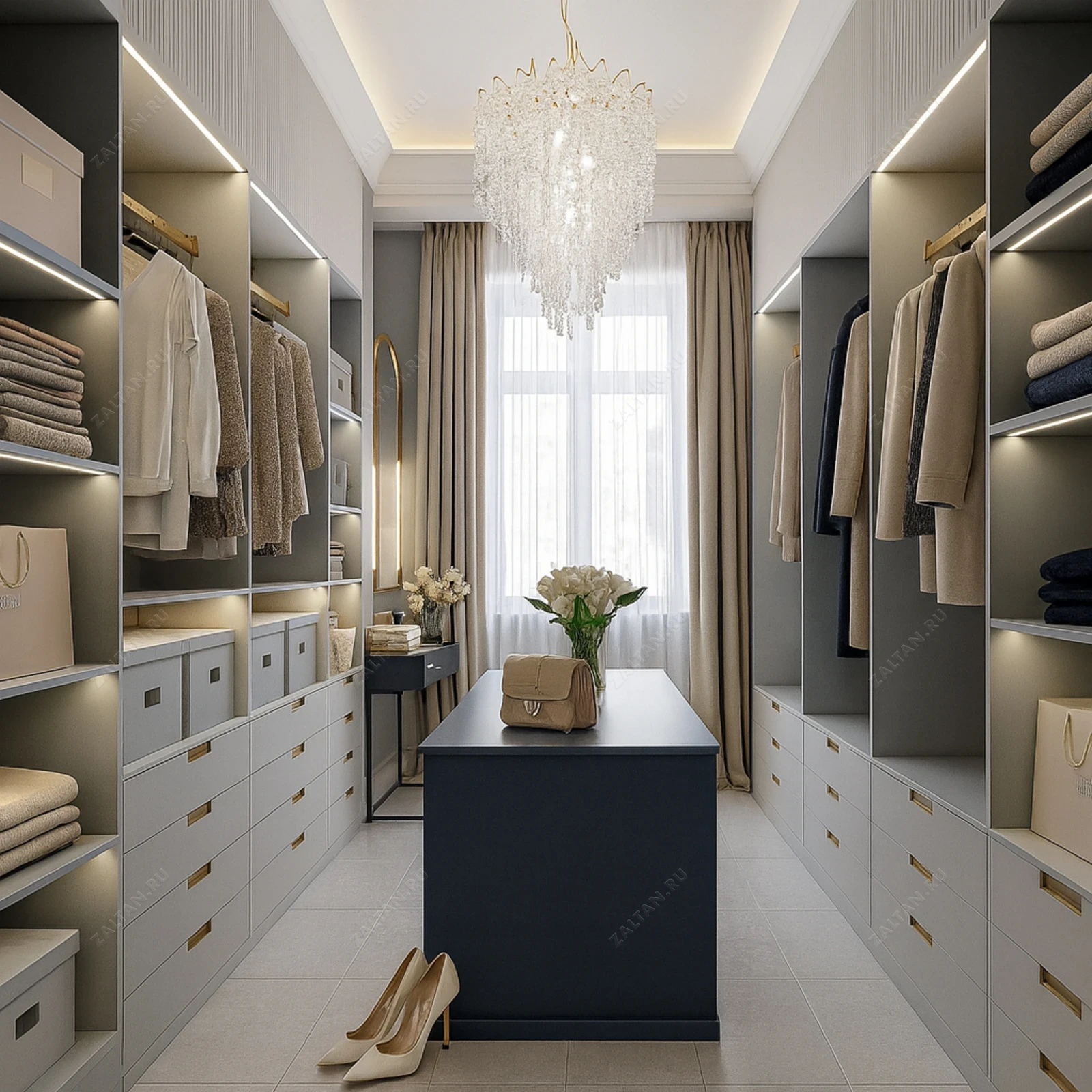 Премиальная встроенная гардеробная с центральным островом и продуманными местами хранения. Матовые фасады и тёплая подсветка создают спокойную, элегантную атмосферу.