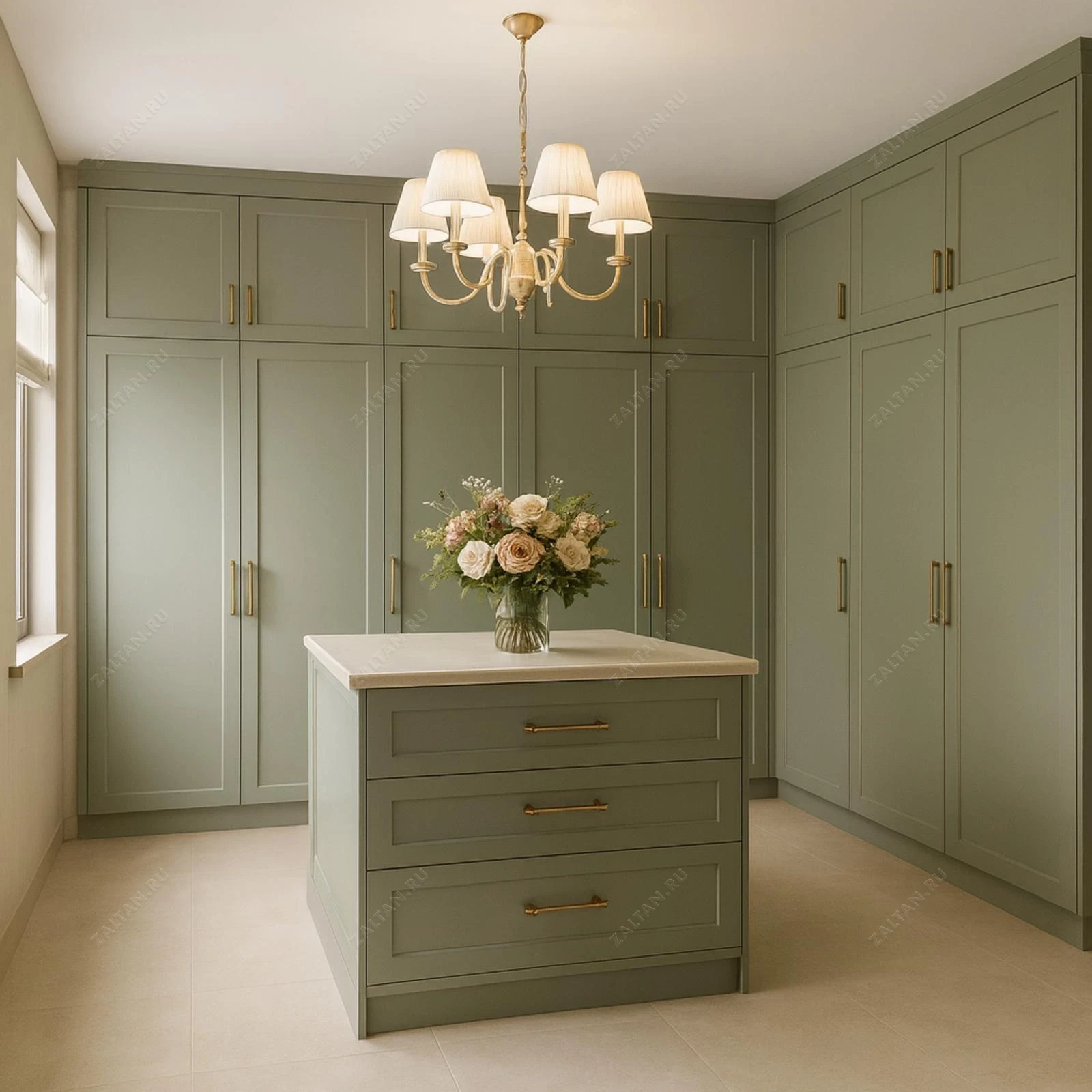 Индивидуальная гардеробная в мягком зелёном тоне — элегантное решение для спальни или отдельной комнаты хранения. Фасады с филёнкой выполнены из МДФ с эмалью, встроенные шкафы идут до потолка, а центральный остров с тремя широкими ящиками добавляет удобства при хранении.