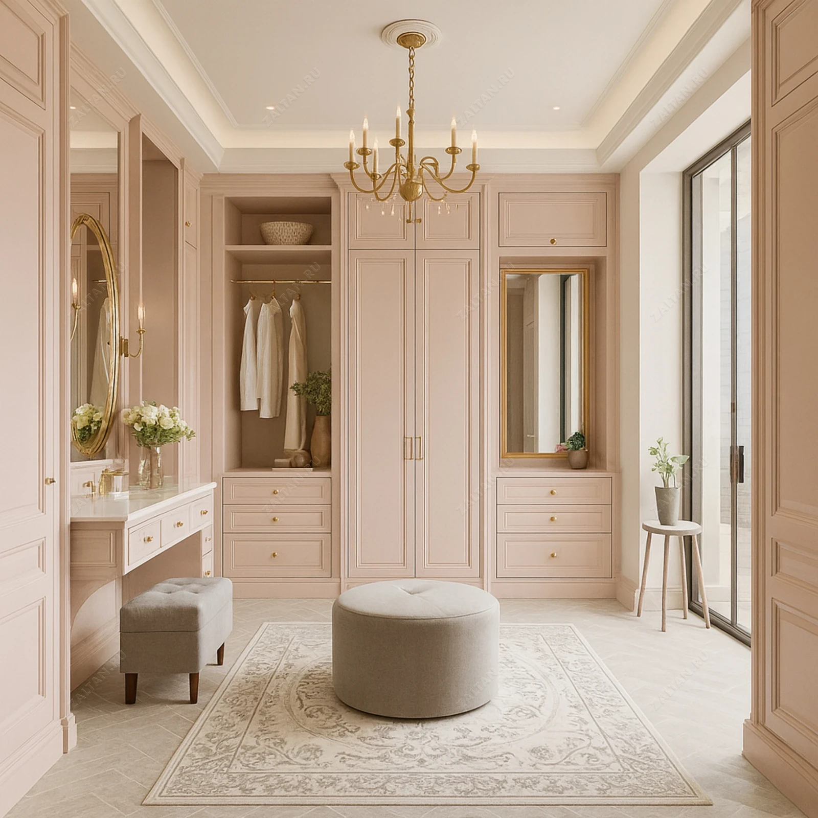 Пудровая встроенная гардеробная в неоклассическом стиле. Функциональная композиция включает центральный распашной шкаф, открытые ниши, выдвижные ящики и туалетный столик с зеркалом. Фасады — окрашенный МДФ с фрезеровкой, фурнитура — золотистая латунь.
