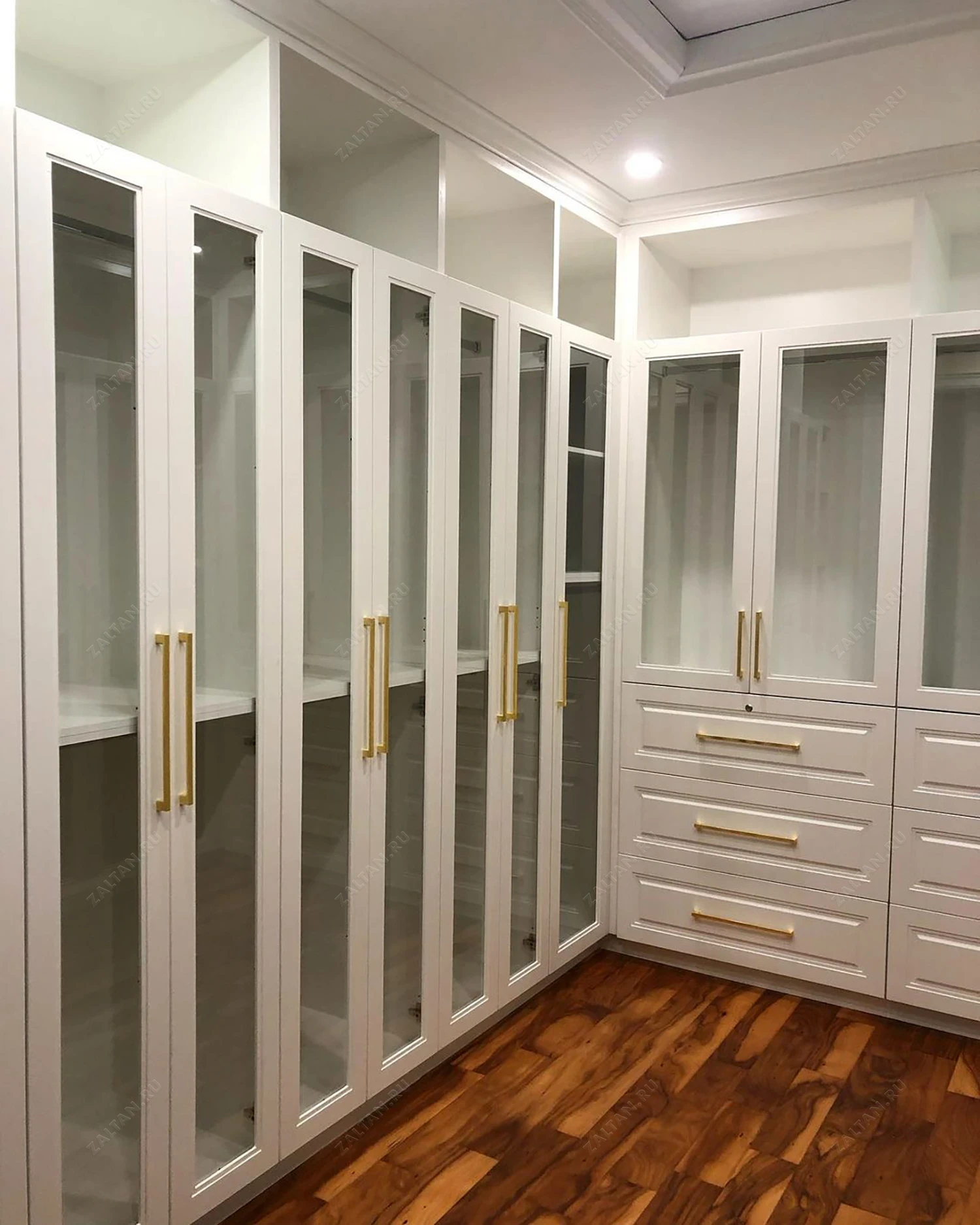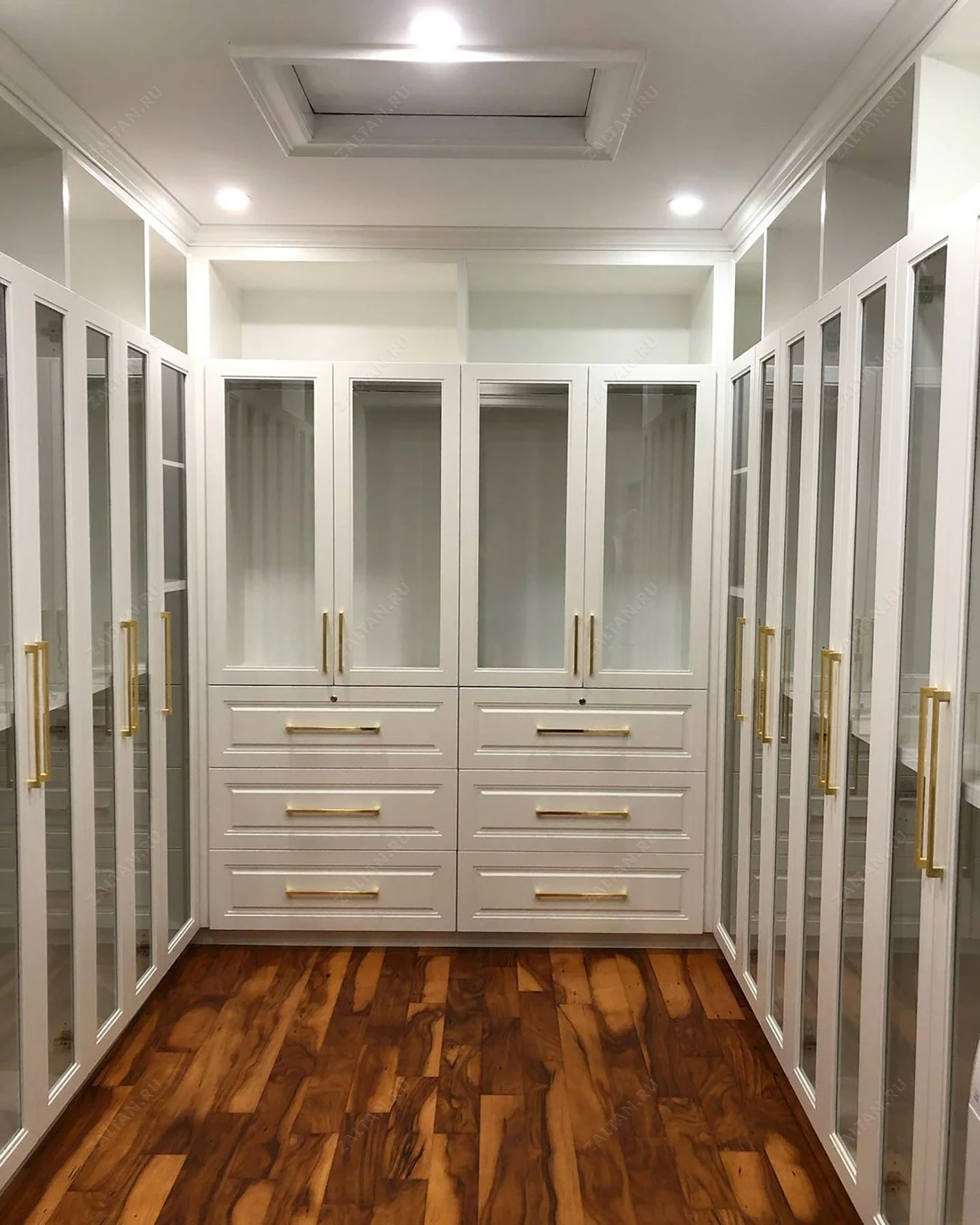 Гардеробная оформлена в светлых тонах, что визуально расширяет пространство. Стеклянные двери добавляют лёгкости, а золотые ручки придают роскошный вид.