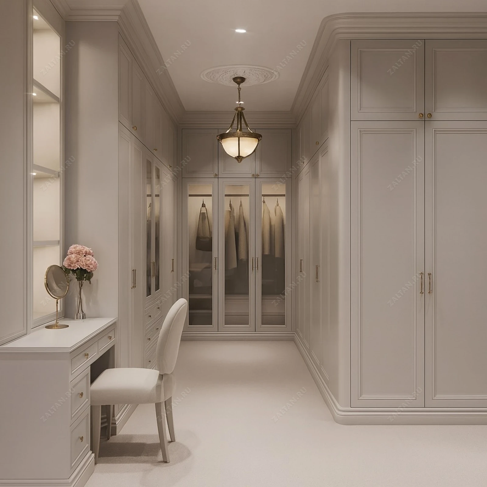 Индивидуальная гардеробная в неоклассическом стиле: филёнчатые фасады, матовое кремовое покрытие и стеклянные витрины. Решение разработано для удобной организации гардероба и эстетики спальни.