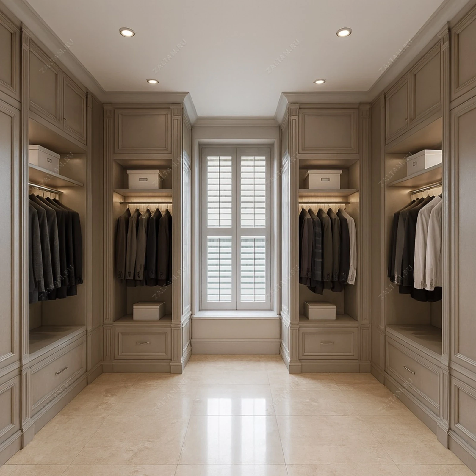 Индивидуальная встроенная гардеробная в неоклассическом стиле — продуманное решение для ценителей порядка и эстетики. Выполнена из качественного МДФ с декоративной филёнкой и карнизной отделкой, с интегрированной подсветкой в секциях.