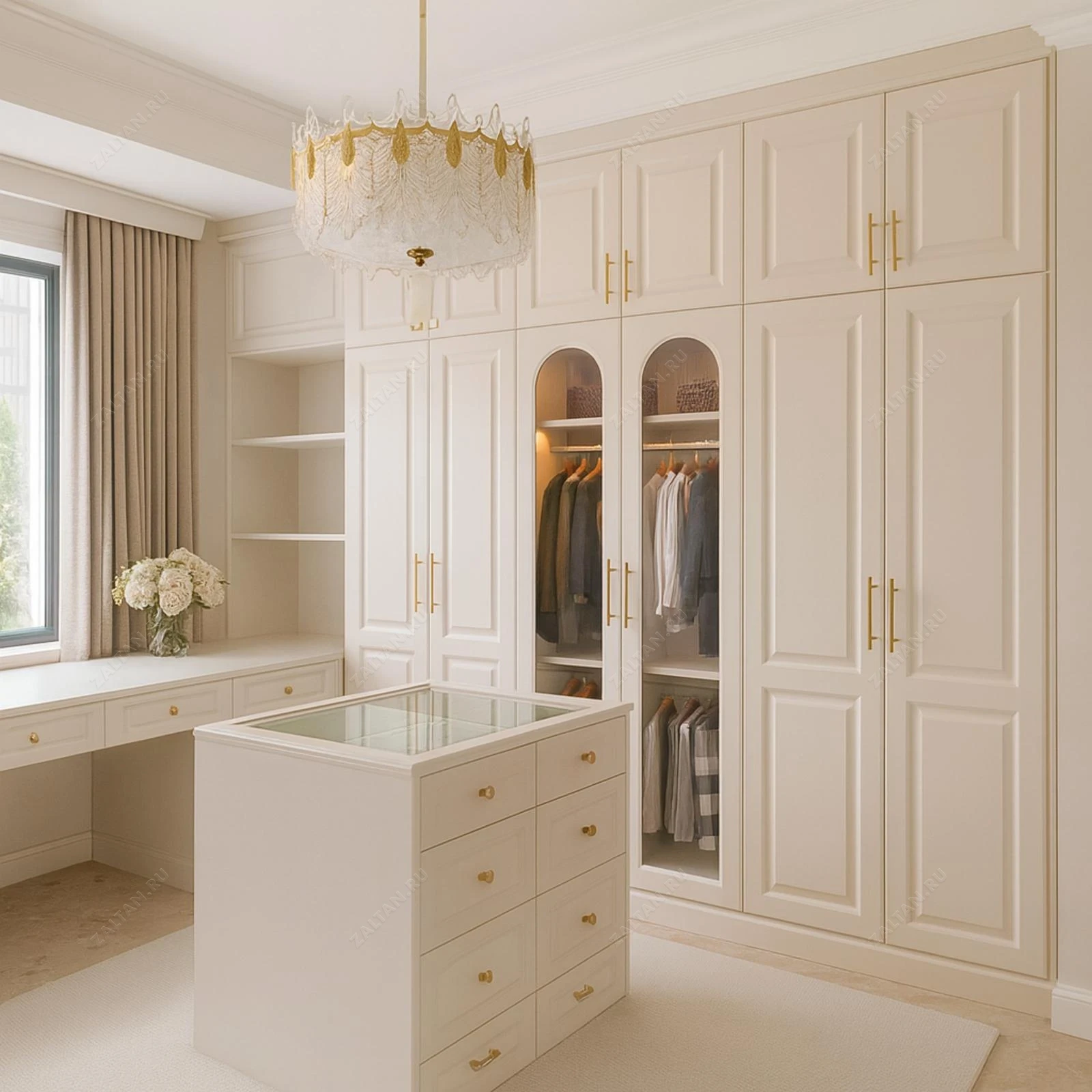 Элегантная встроенная гардеробная в неоклассическом стиле, выполненная в кремово‑бежевой палитре с золотыми ручками. Композиция включает высокий шкаф до потолка с арочными витринами, подсветкой и внутренней организацией для рубашек, брюк и обуви, а также центральный остров‑комод с застеклённой крышкой для аксессуаров.