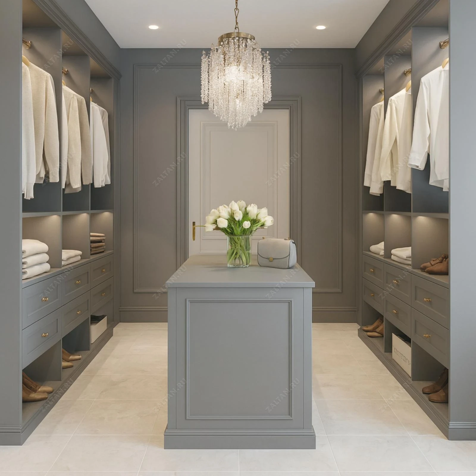 Элегантная гардеробная по индивидуальным размерам: классические филенчатые панели, открытые секции для одежды и глубокие ящики для аксессуаров. Центральный остров — рабочая поверхность и дополнительное хранение.