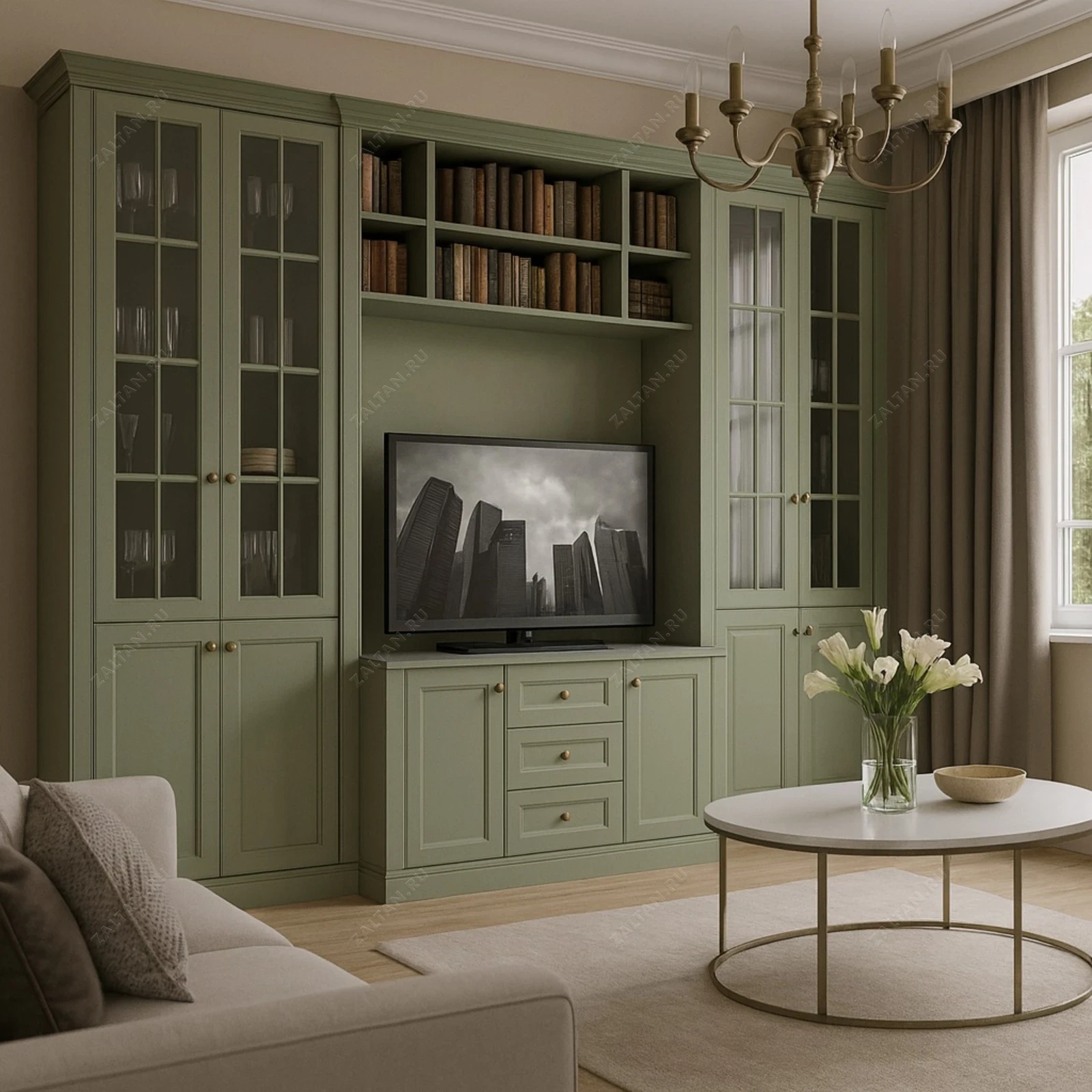 Классическая корпусная стенка на заказ в мягком зелёном тоне. Комбинация витрин со стеклом, открытых полок и тумбы под ТВ создаёт элегантную, функциональную композицию для гостиной.