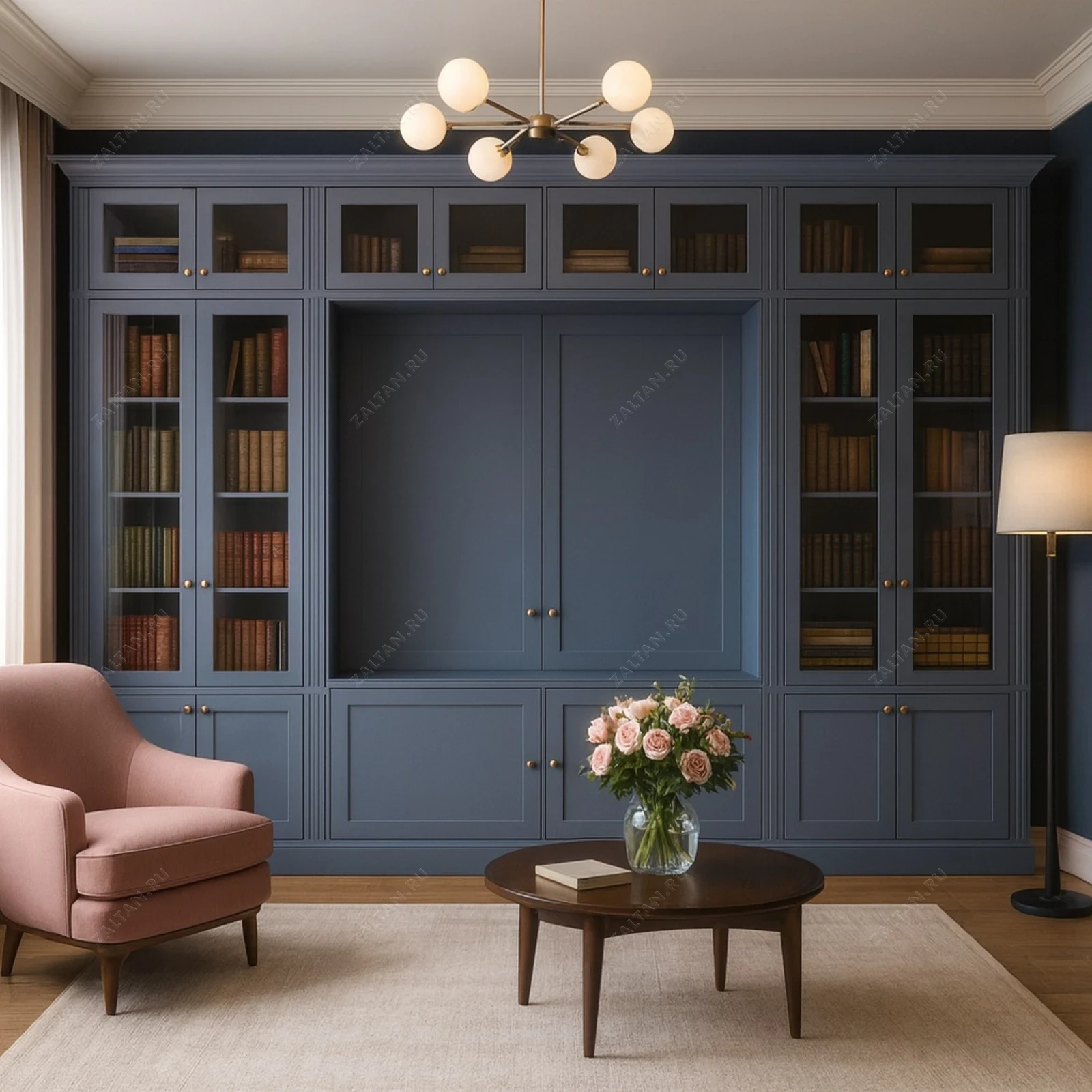- Функция: витрины для книг, закрытые шкафы для хранения, антресоли сверху.