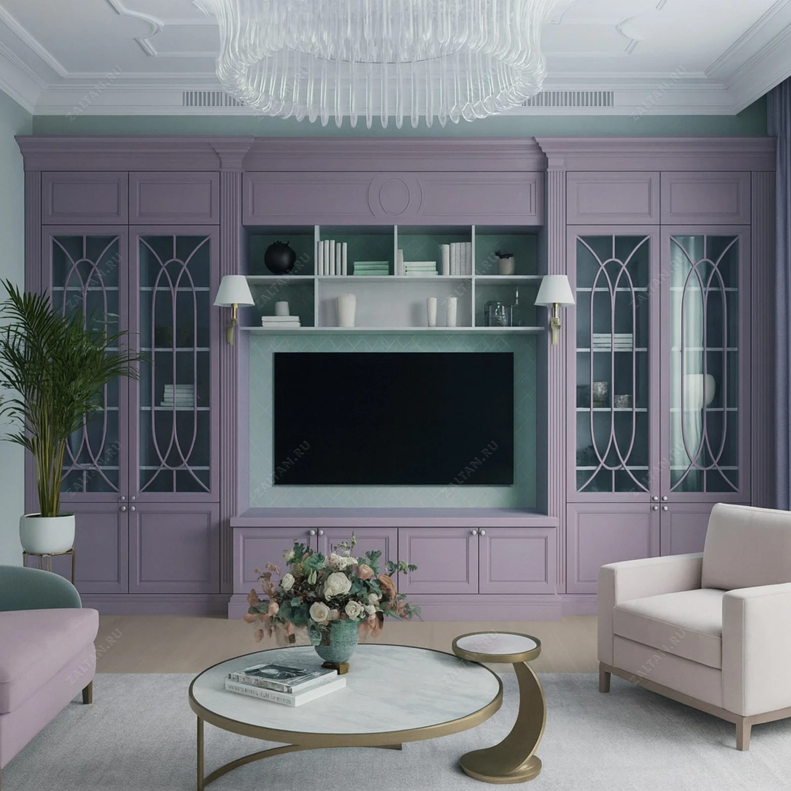 Индивидуальная стенка в неоклассическом стиле: окрашенные МДФ фасады, витринные стеклянные двери с декоративной раскладкой и центральная ниша под ТВ. Низ шкафа закрытый для хранения, открытые полки для декора и книг, верхняя коронка с пилястрами придает архитектурный эффект.