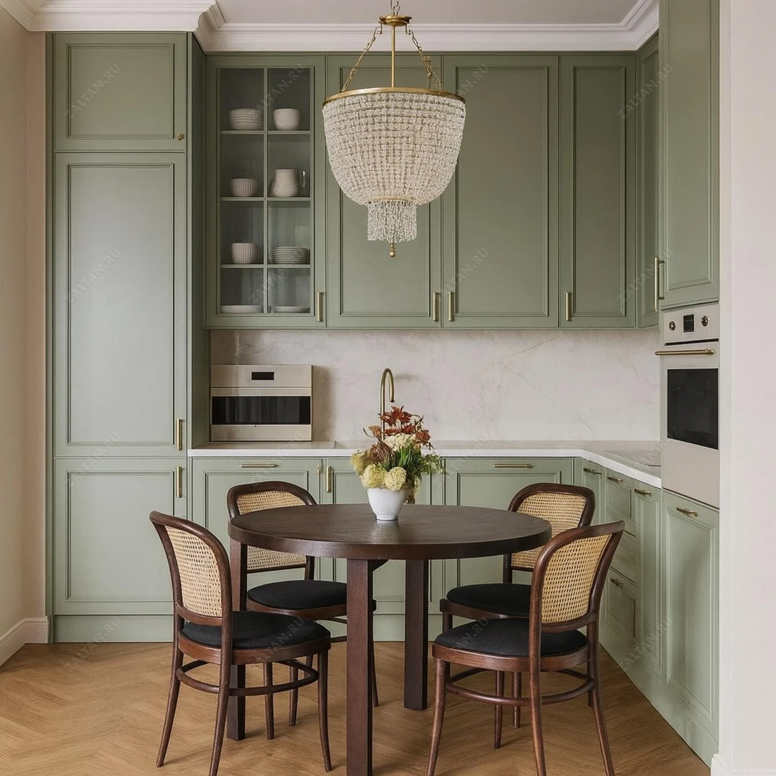 Подходит для заказчиков, ищущих премиум-отделку и аккуратную классическую стилистику в небольшой кухне.