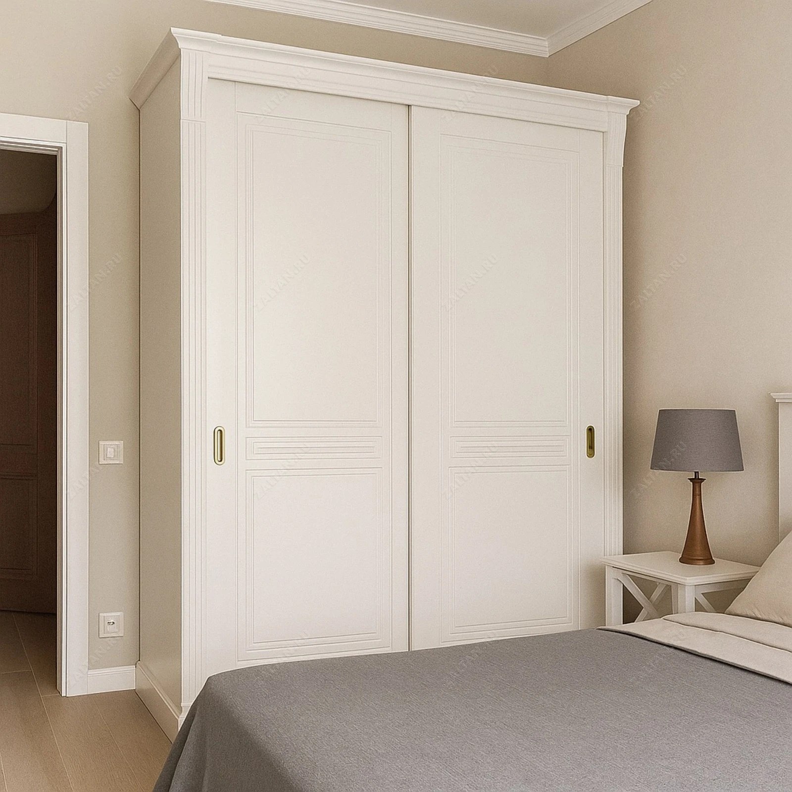 Элегантный шкаф-купе в неоклассическом стиле для спальни, выполнен на заказ по индивидуальным размерам. Корпус из качественной плиты, фасады из МДФ с эмалевой покраской и аккуратной фрезеровкой, скрытые врезные ручки и карнизный профиль сверху.