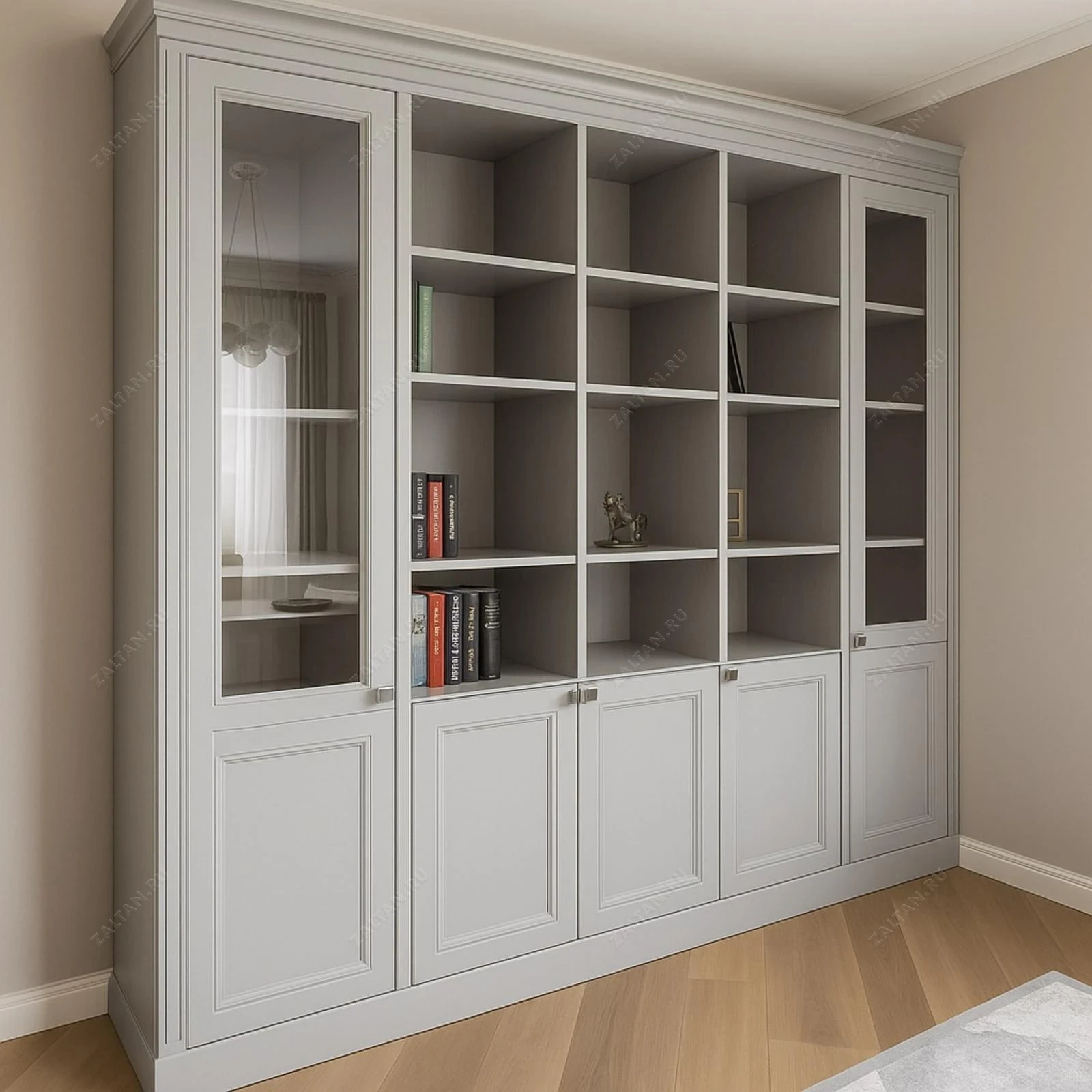 - Конструкция: встроенная во всю стену, регулируемые полки, декоративные пилястры и карниз.
