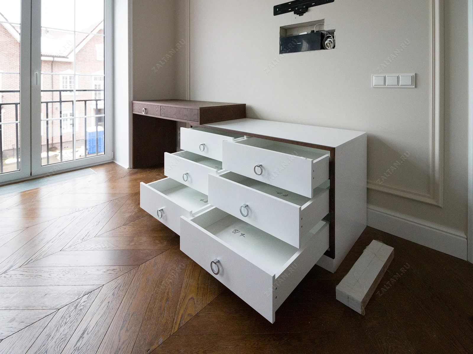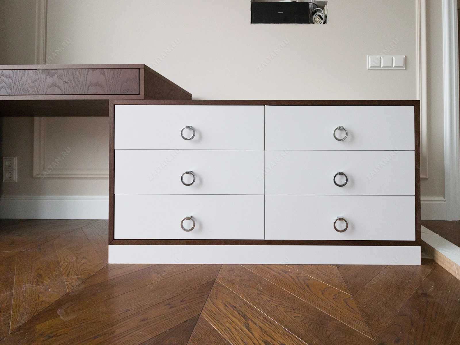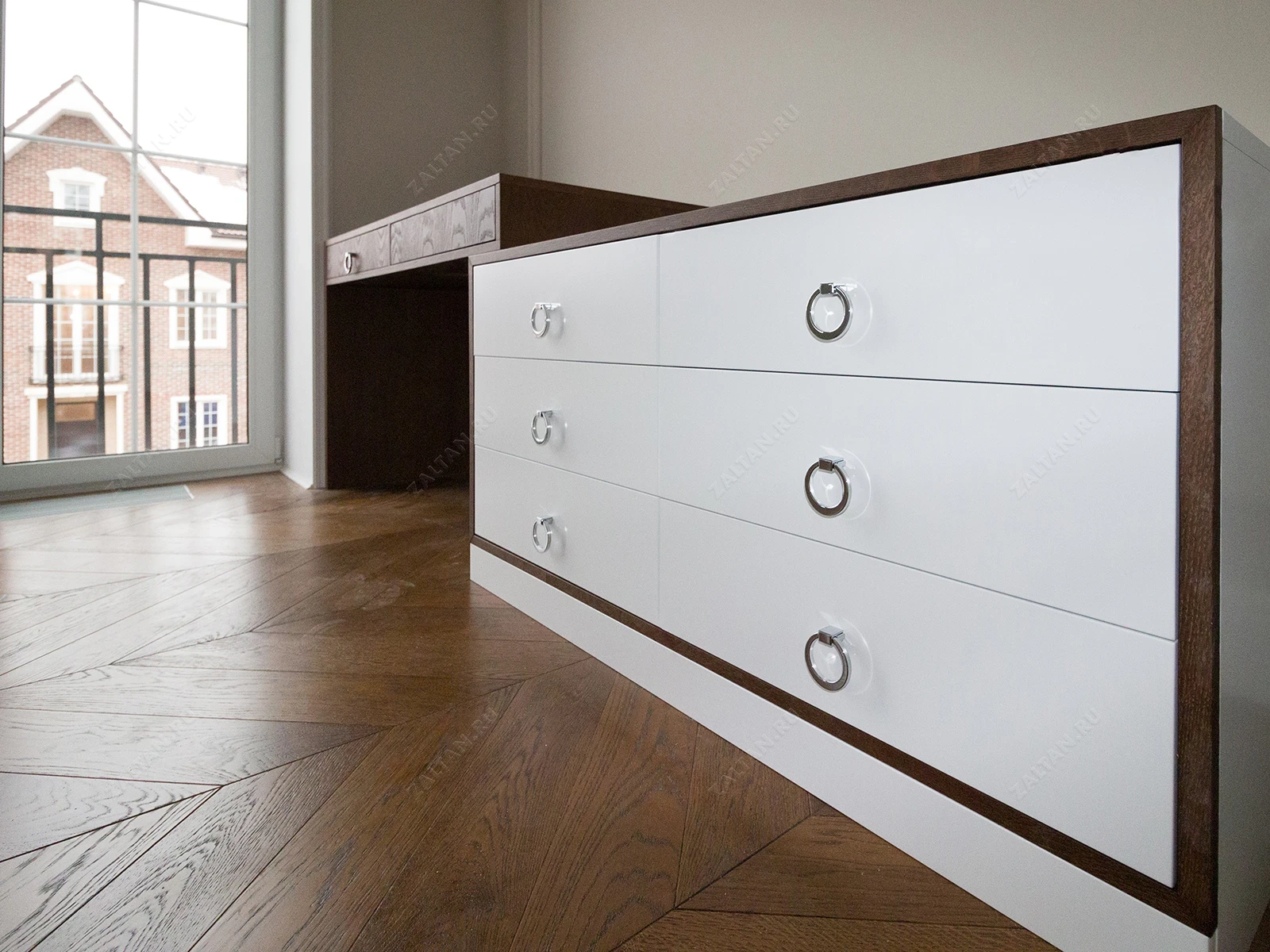 Изысканный комод с ящиками Брюс, выполнен из крашеного МДФ, и гармонично сочетается с туалетным столиком из шпона дуба. Сочетание матовой белизны комода и теплого оттенка дуба придает интерьеру гостиной современный и уютный вид.