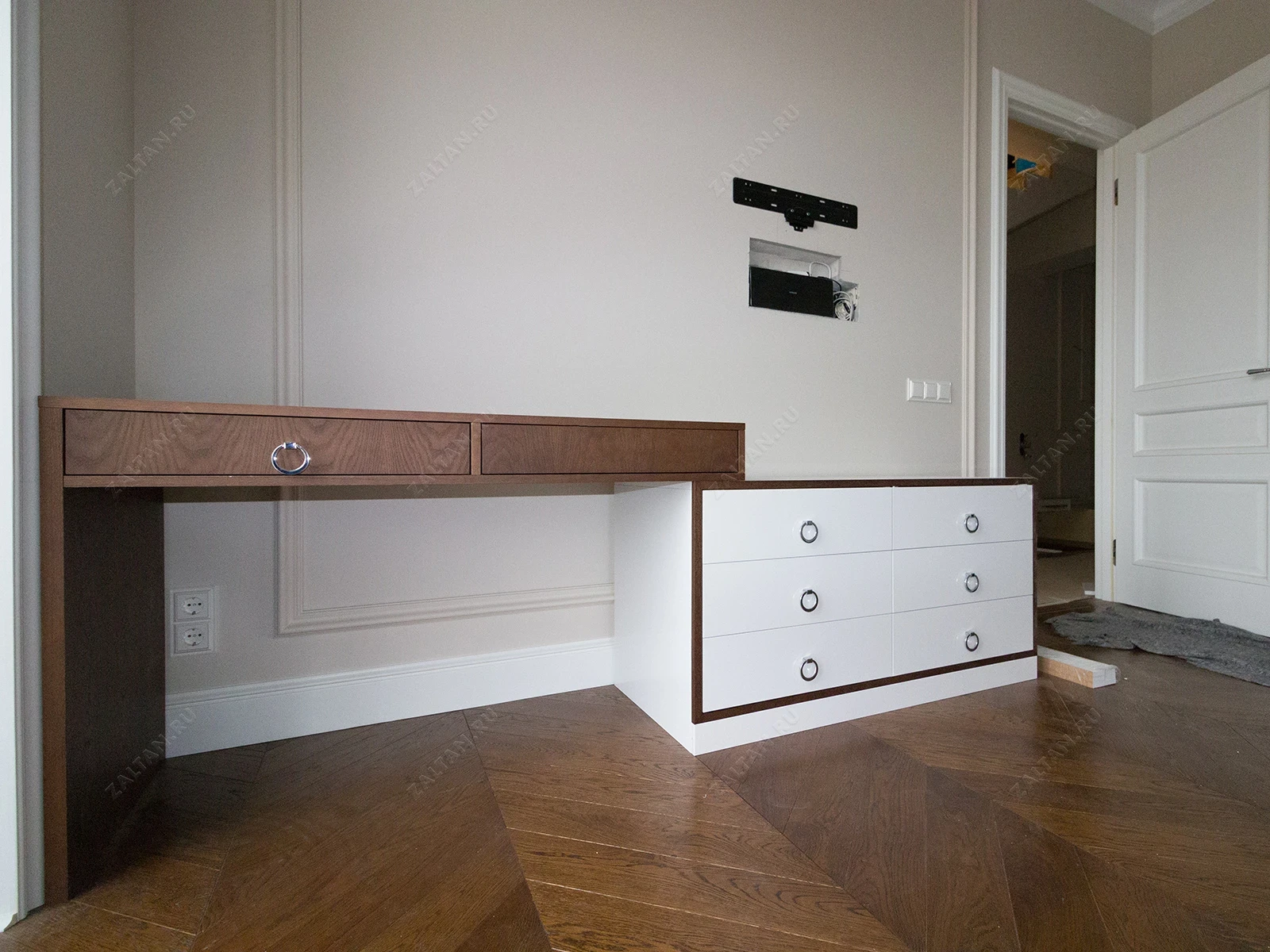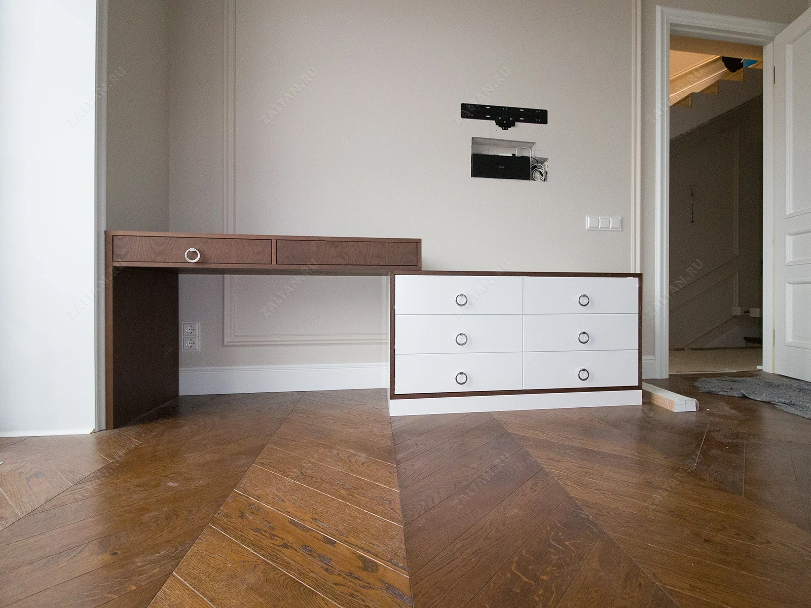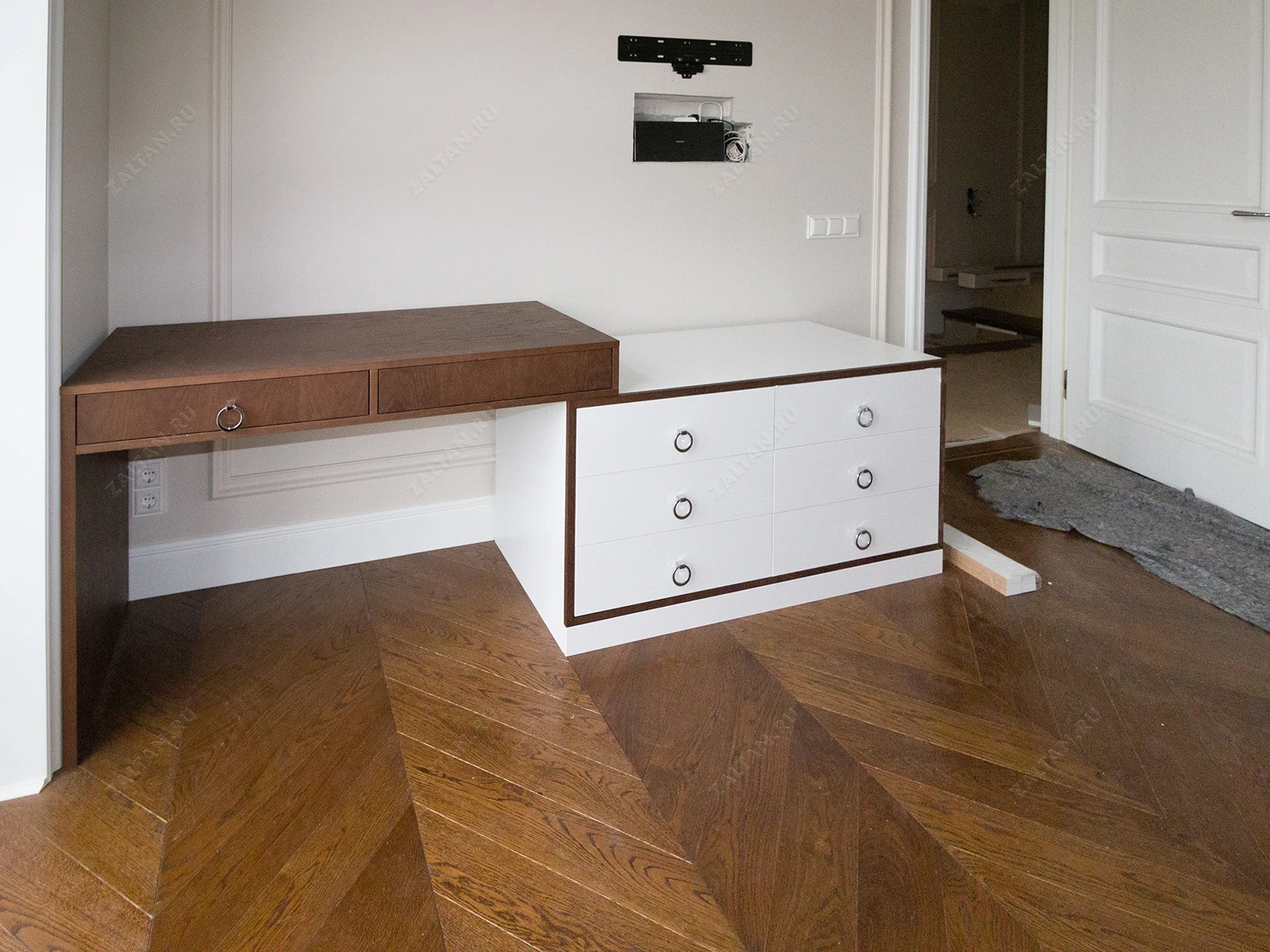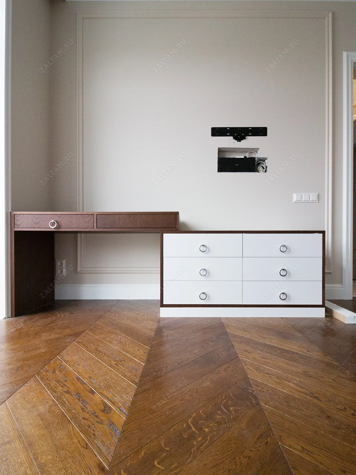 Изысканный комод с ящиками Брюс, выполнен из крашеного МДФ, и гармонично сочетается с туалетным столиком из шпона дуба. Сочетание матовой белизны комода и теплого оттенка дуба придает интерьеру гостиной современный и уютный вид.
