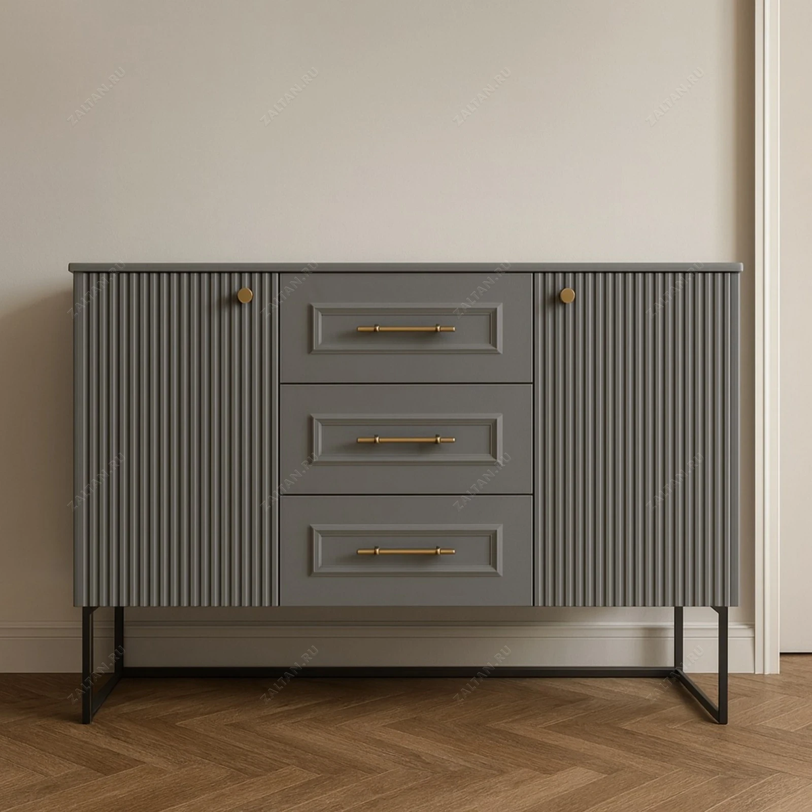 Элегантный серый комод-консоль на тонких металлических ножках. Центральная колонна из трёх выдвижных ящиков с филёнчатыми фасадами и латунными ручками сочетается с реечными дверцами по бокам — стильное и практичное решение для прихожей или гостиной.