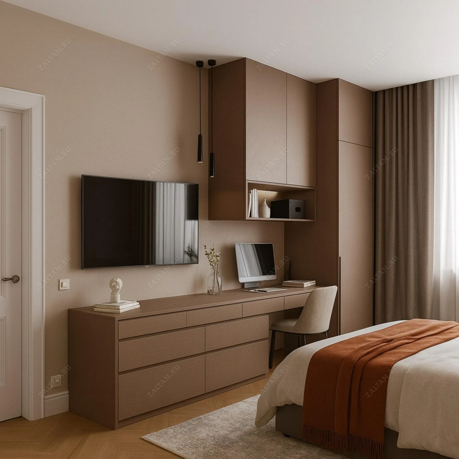 Элегантная корпусная композиция для спальни — низкий комод с интегрированной рабочей зоной и высоким шкафом до потолка. Визуально минималистичная, выполнена в матовом коричневом тоне, подходит для комфортного хранения и организованной работы дома.