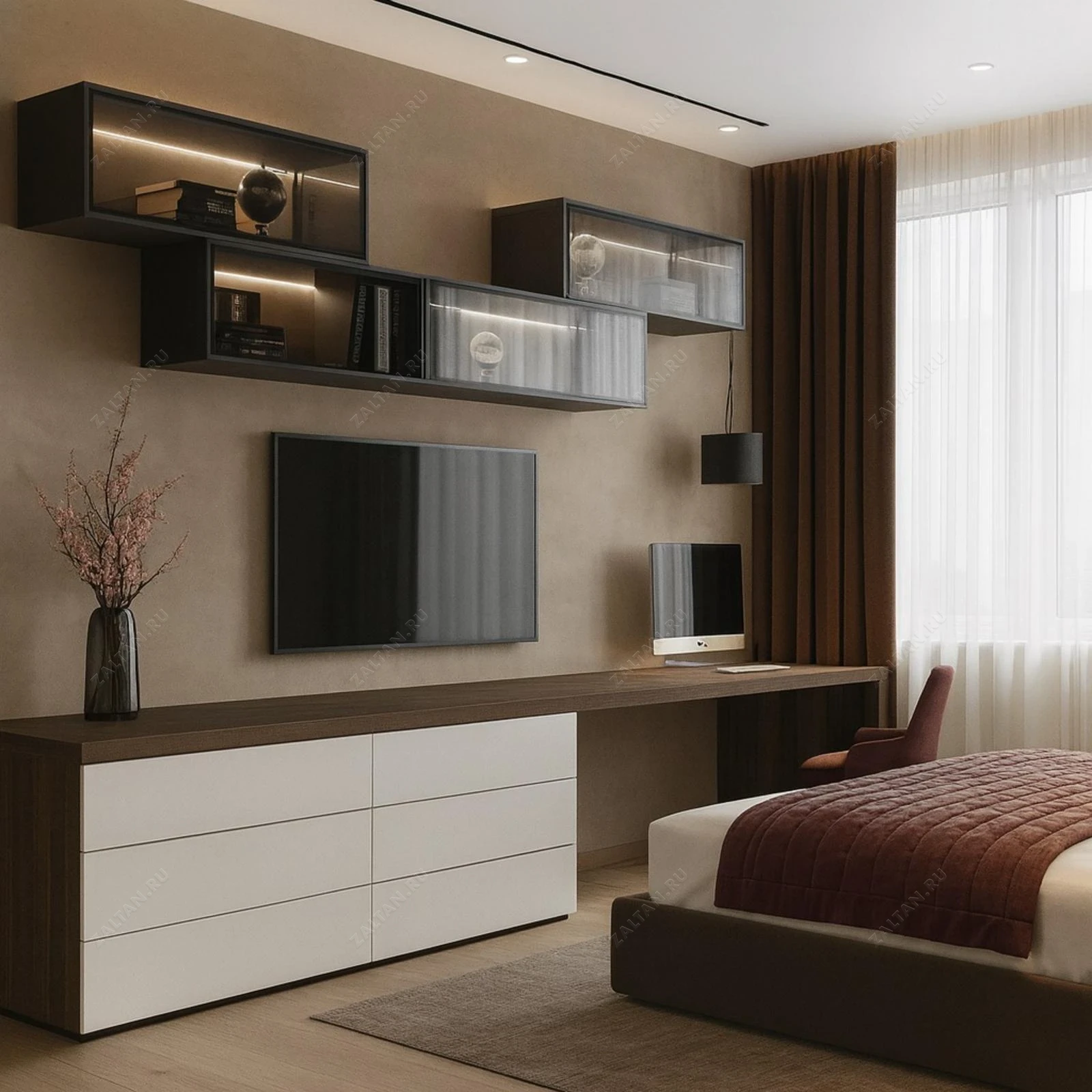 Анализ дизайнера: модульная композиция для спальни сочетает низкий комод с интегрированной рабочей столешницей и навесными витринами с тонированным стеклом и подсветкой. Чёткие лаконичные линии, бесшовные фасады без ручек и контраст деревянной столешницы с белыми фасадами.