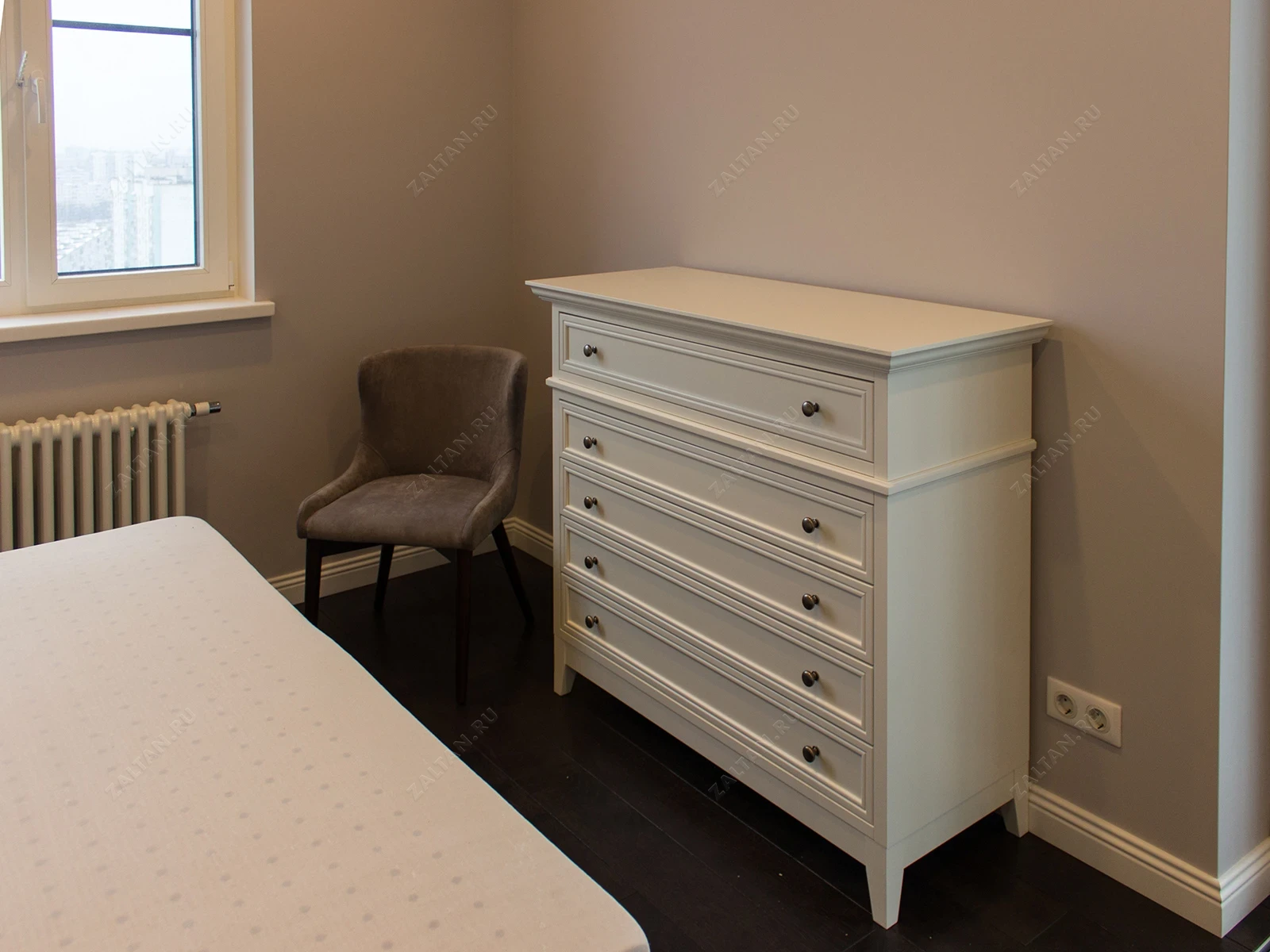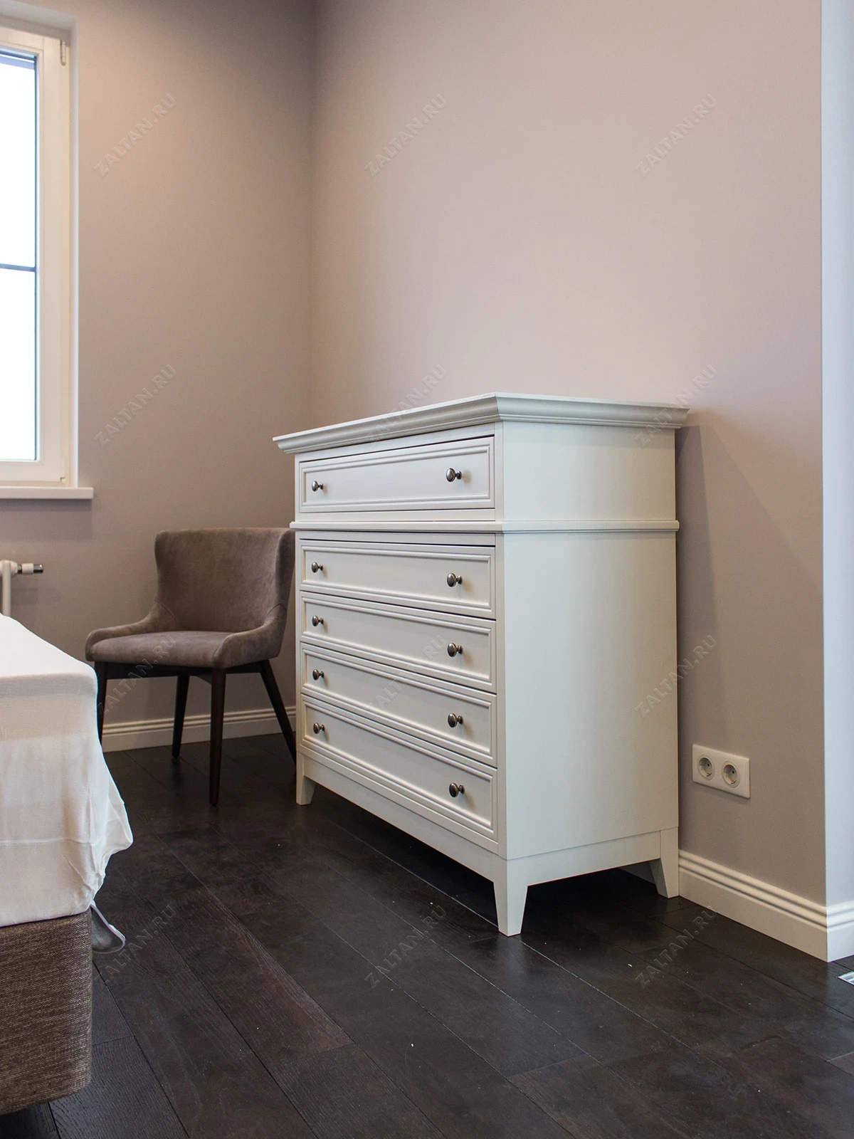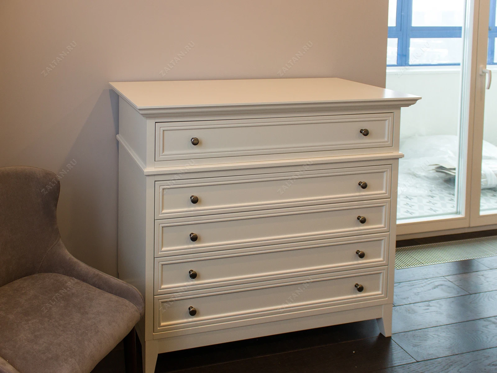 Комод оснащен пятью ящиками, обеспечивающими достаточно пространства для хранения одежды, белья или других личных вещей. Ручки ящиков подобраны в соответствии с общим дизайном, их темный цвет контрастирует с белоснежной поверхностью, что добавляет акценты в облик комода.