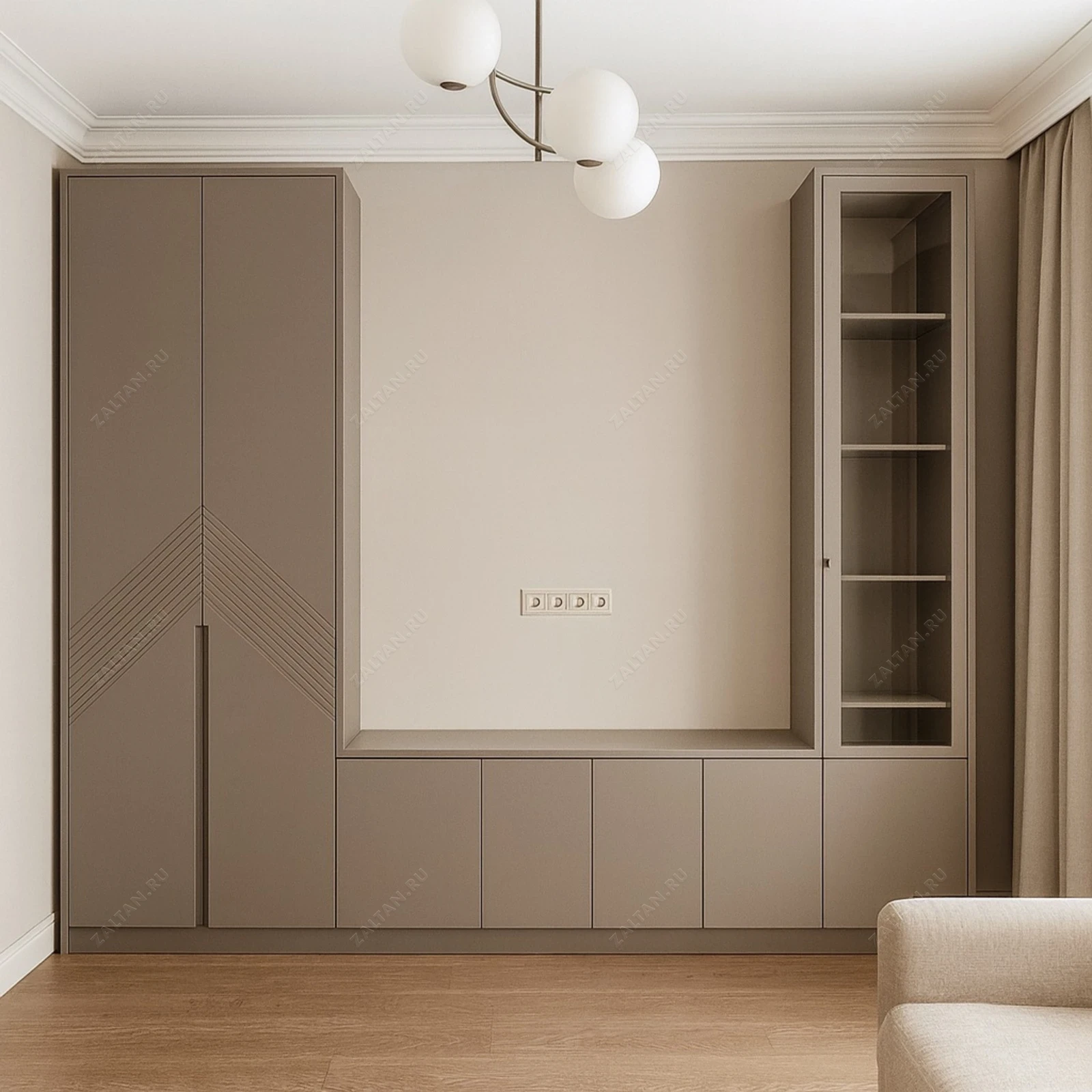Минималистичная корпусная стенка под ТВ, выполненная по индивидуальным размерам. Композиция сочетает закрытые шкафы, низкую тумбу для техники и высокую витрину со стеклянными полками — удобна для демонстрации и хранения.