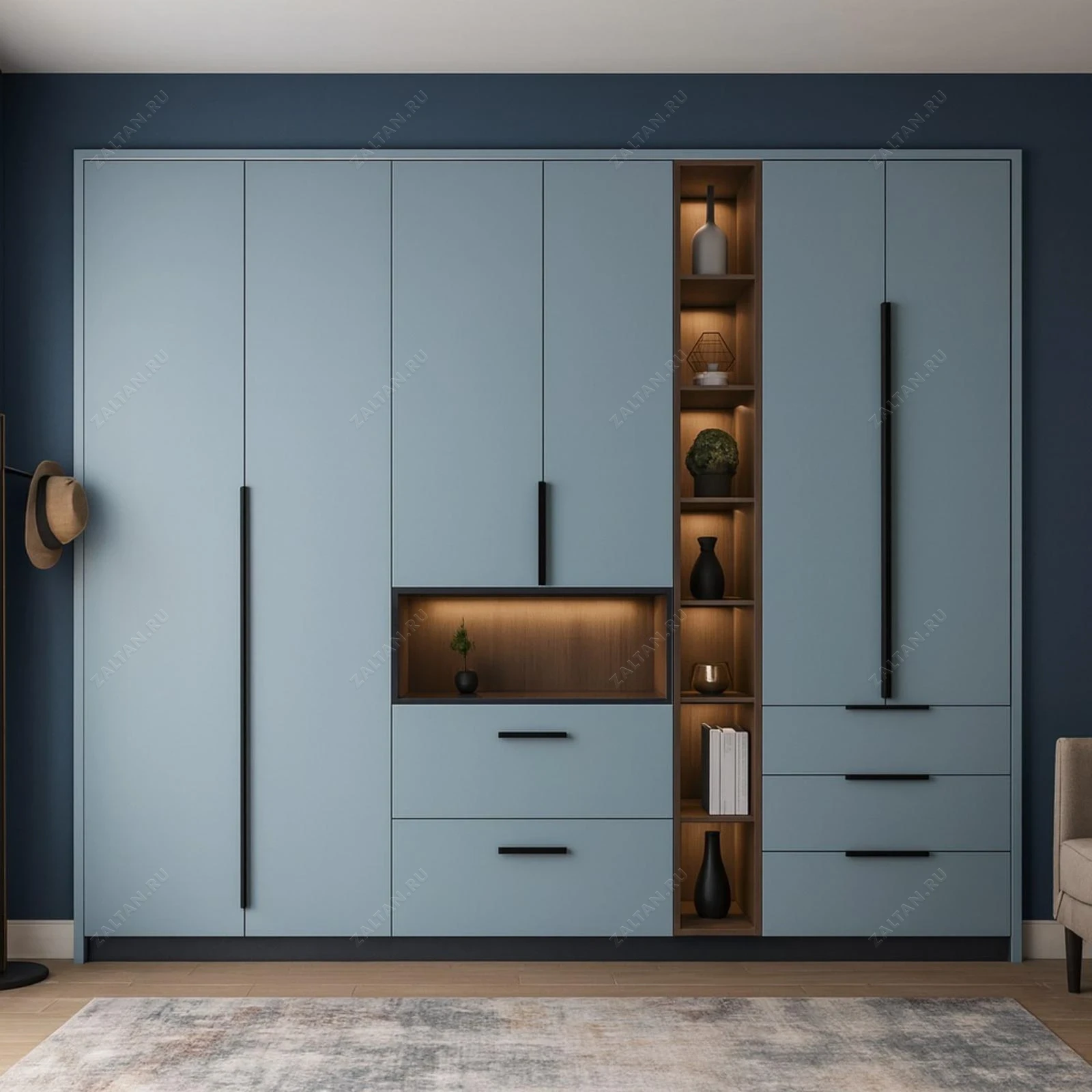 Современный корпусный шкаф в минималистичном стиле: матовые голубые фасады, тёплая деревянная ниша с подсветкой и длинные чёрные ручки. Продуманная внутренняя планировка включает платяную секцию, выдвижные ящики и открытые полки для декора.