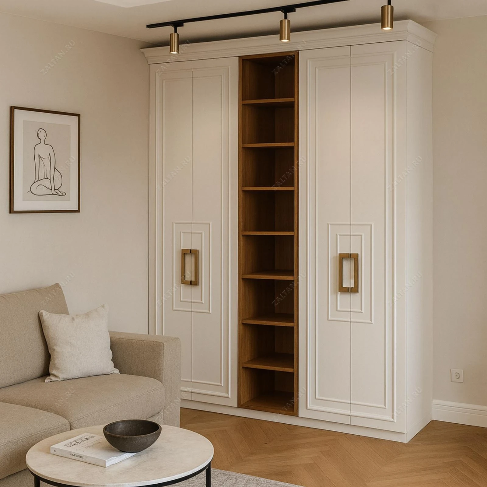 Элегантный корпусный шкаф в неоклассическом стиле. Премиальная отделка — кремовый матовый фасад и открытая внутренняя секция под шпон «дуб». Идеален для гостиной или спальни, сочетает закрытые отсеки для одежды и открытые полки для декора.