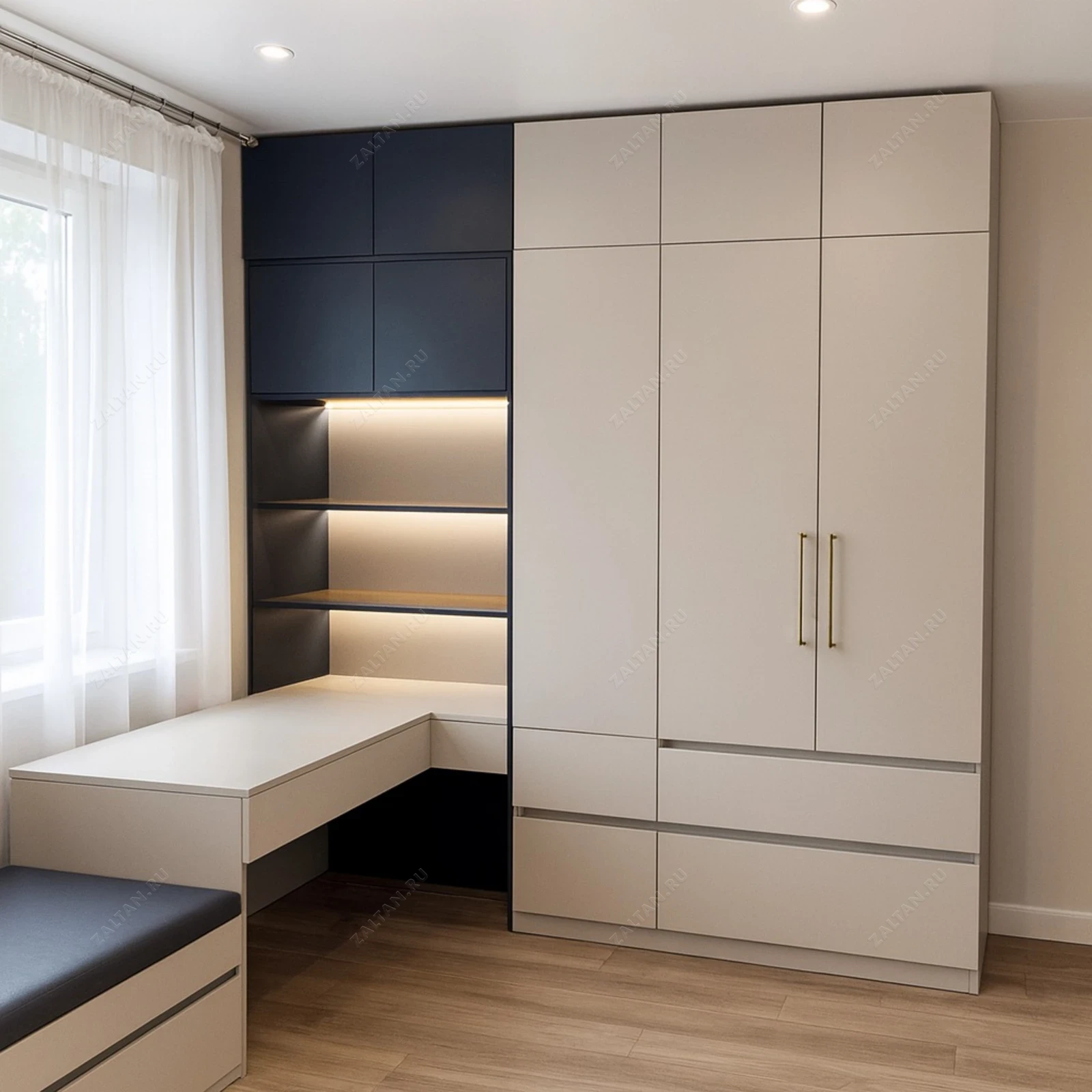 Корпусный шкаф с интегрированной рабочей зоной — решение для спальни или компактного кабинета. Изделие выполнено на заказ в двухцветной гамме: кремовый матовый фасад и синие акценты. Продуманная внутренняя организация: отделения для одежды, выдвижные ящики и открытые полки с точечной подсветкой.