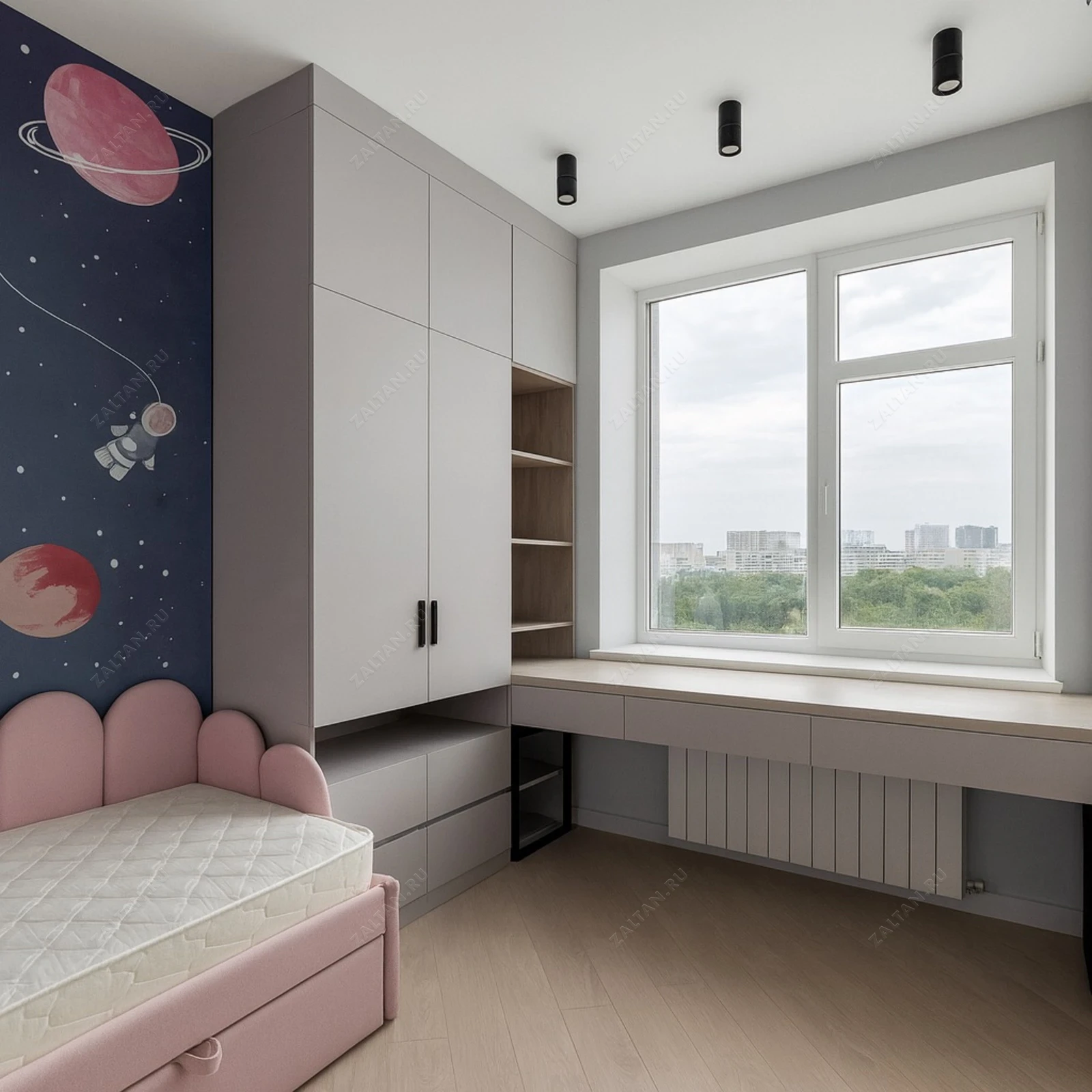 Компактный встроенный мебельный комплекс для детской или небольшой спальни: шкаф с антресолью, открытые полки и длинная рабочая поверхность у окна. Решение выполнено в сдержанной светло-серой гамме с фактурой древесины на открытых полках.