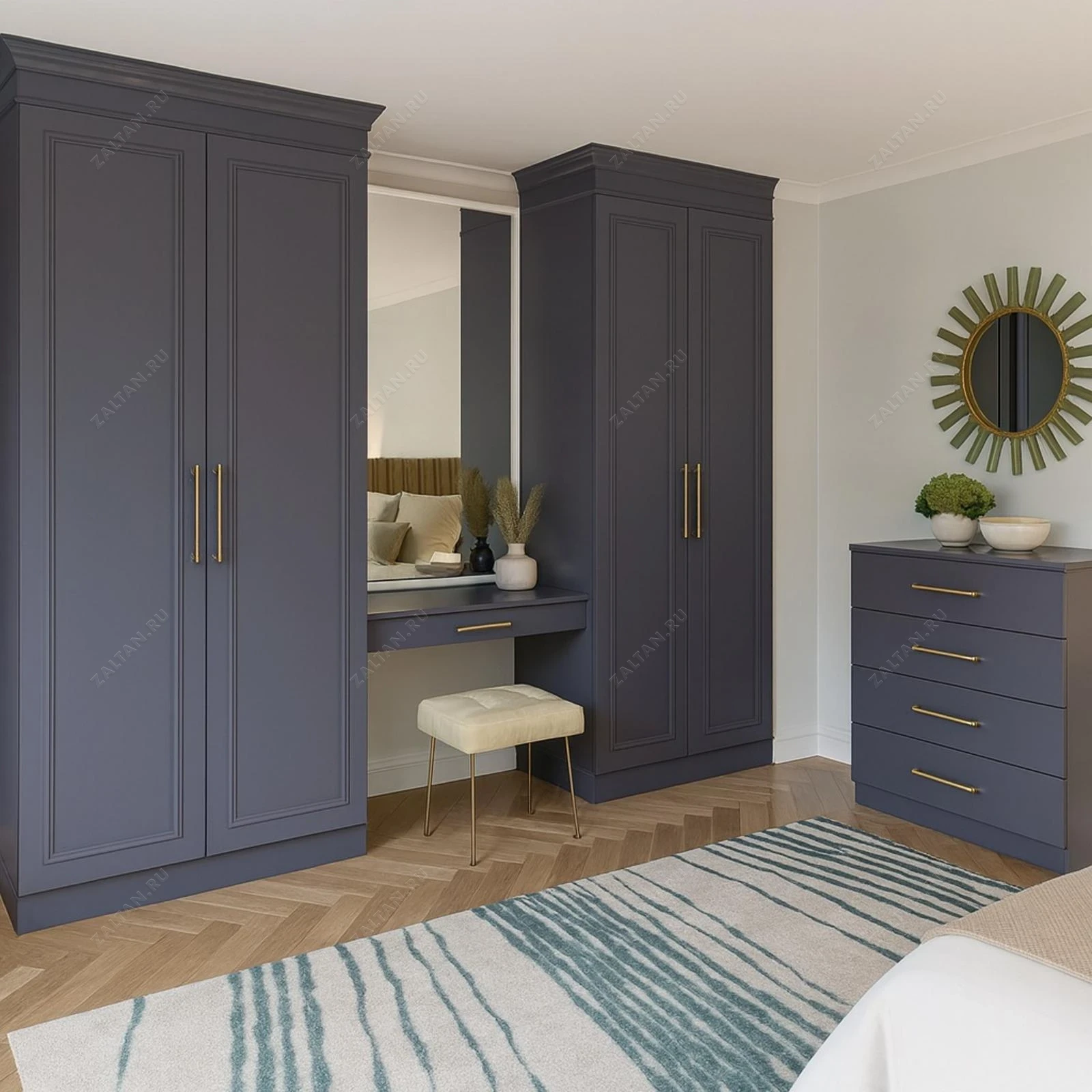Элегантный корпусный гарнитур премиум-класса — сочетание классической филёнки и современной лаконичности. Решение для спальни: две высокие тумбы-гардероба, встроенное трюмо с выдвижным ящиком и отдельный комод. Матовые фасады глубокого синего цвета и золотые ручки подчеркивают статус и аккуратность исполнения.