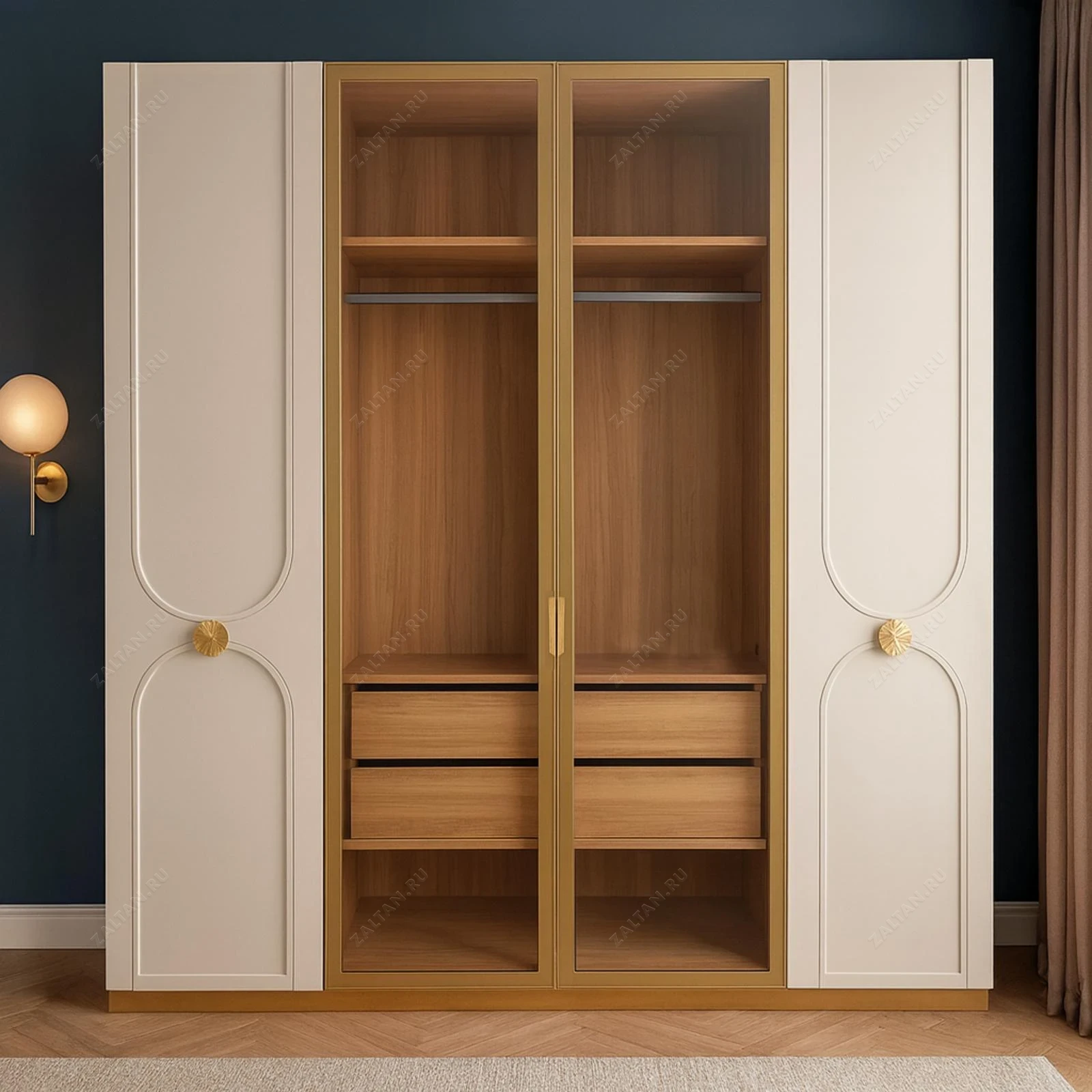 Элегантный корпусный шкаф с двумя витринными стеклянными дверцами и декоративными филёнками в кремовом цвете. Внутри — штанги для плечиков, три выдвижных ящика и открытые полки — оптимальное сочетание хранения и показа вещей.