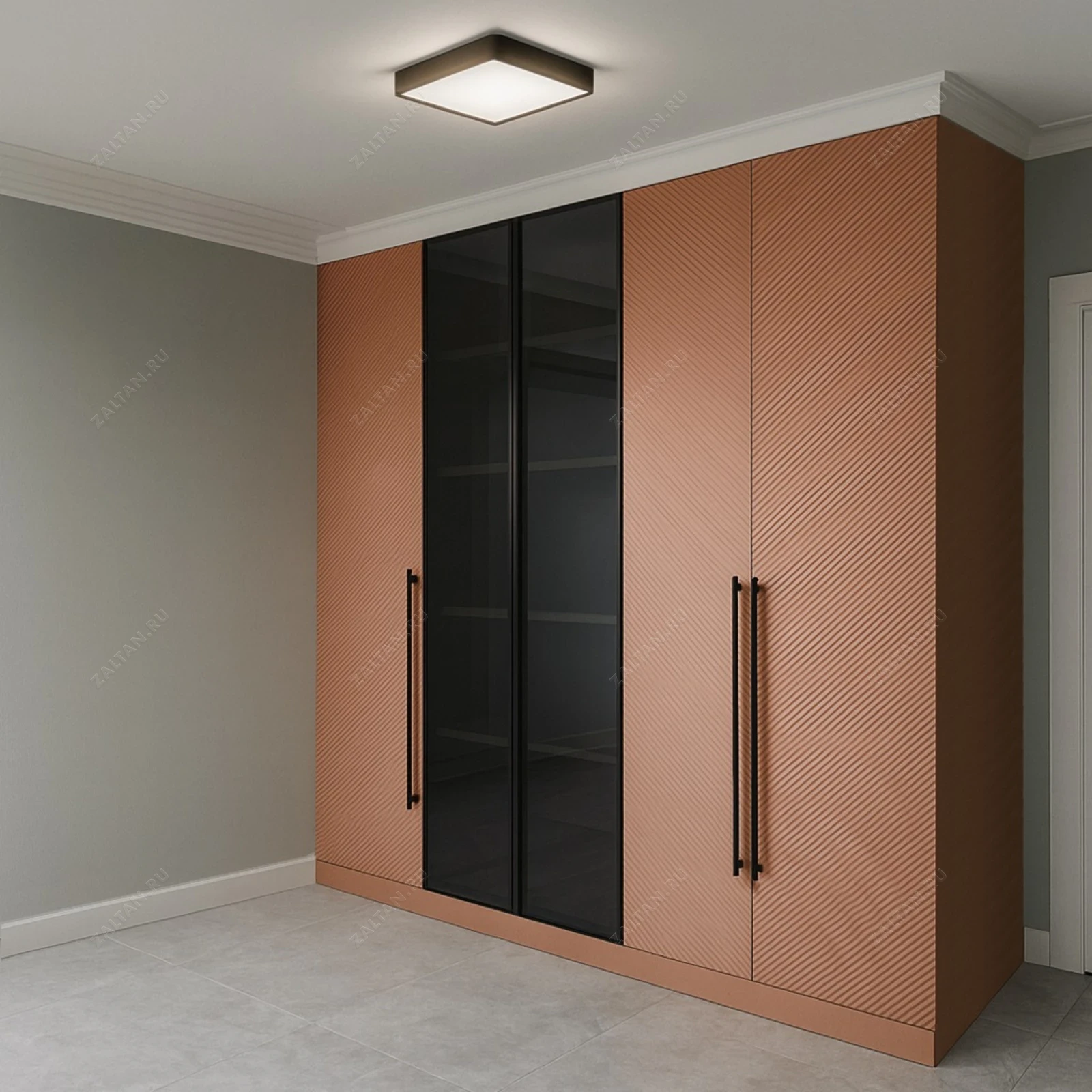 Элегантный корпусный шкаф с центральной витриной — премиальное решение для спальни или прихожей. Фасады с декоративной диагональной фрезеровкой и длинными матовыми ручками создают сдержанный, современный образ.