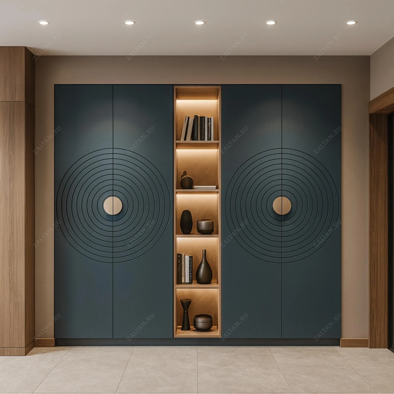 Элегантный шкаф для прихожей по индивидуальным размерам — сочетание премиального качества и лаконичного дизайна. Фасады матовые тёмно-синего цвета с фрезеровкой в виде концентрических кругов, центральная открытая ниша с тёплой встроенной подсветкой и деревянной отделкой.
