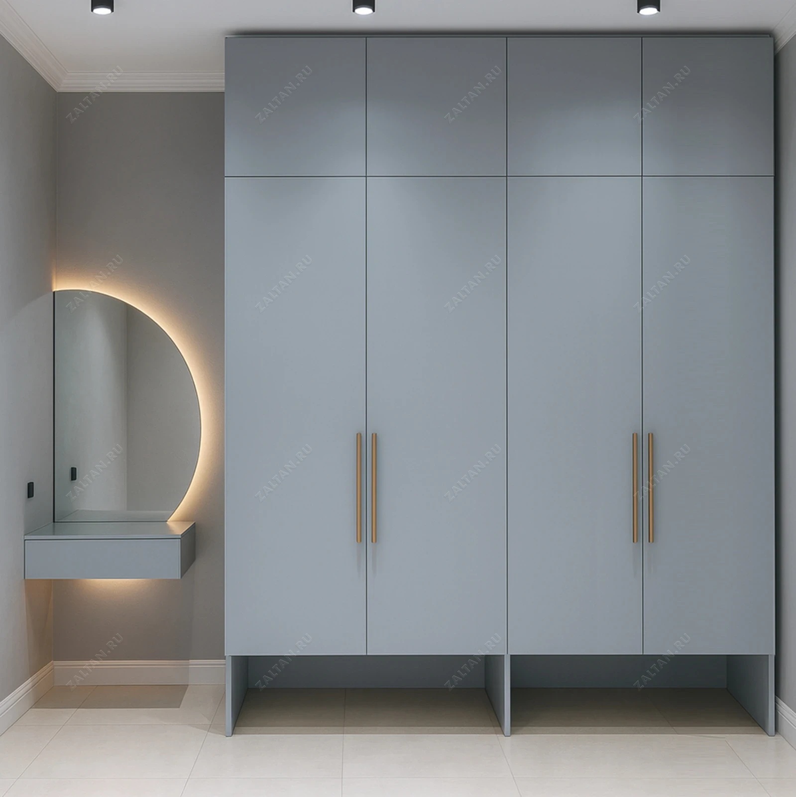 Современный корпусный шкаф для прихожей по индивидуальным размерам. Четкая геометрия, высокая ниша для обуви и антресоли над створками — оптимальное использование высоты помещения. Ручки из металла контрастного оттенка подчеркивают премиальный характер.