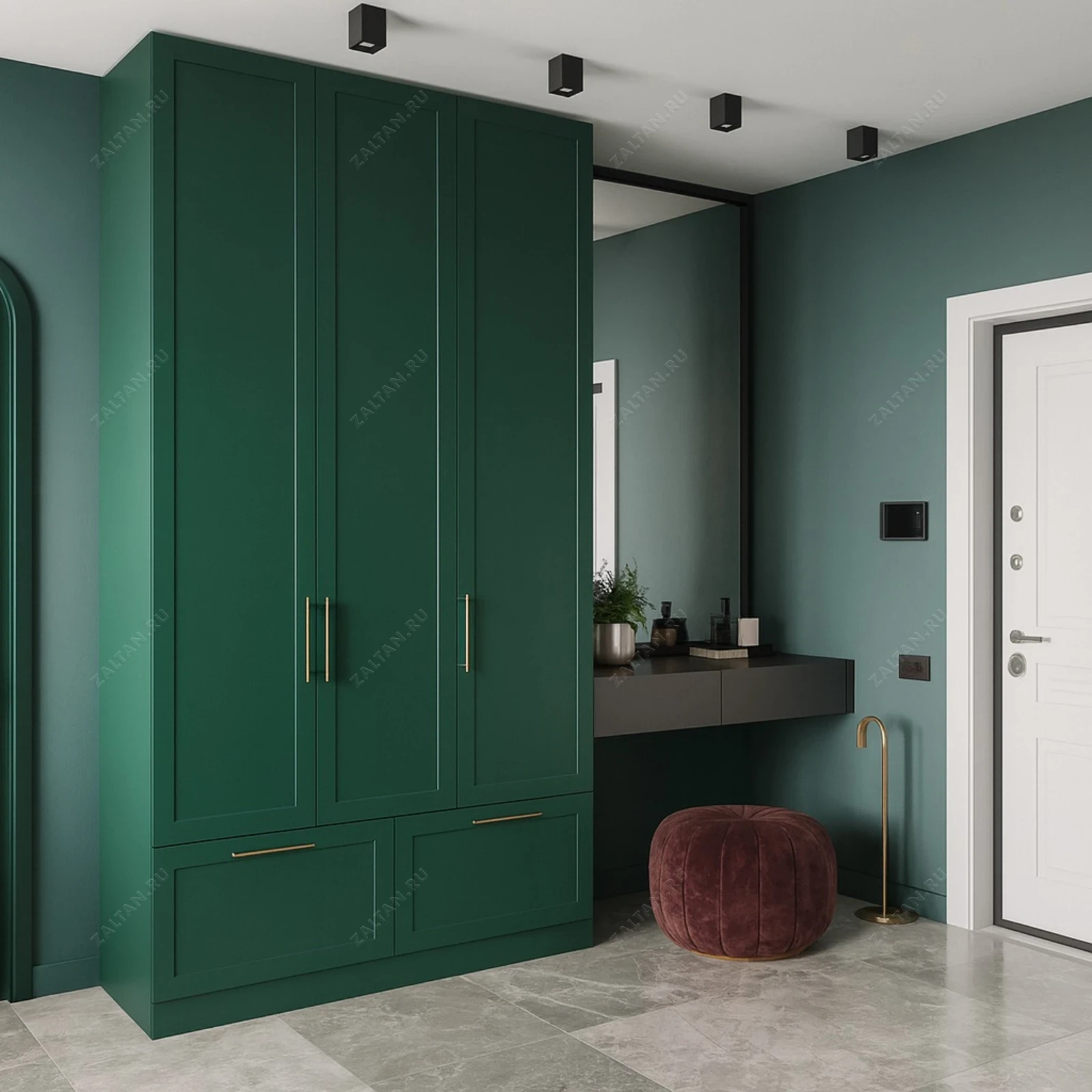 Элегантный корпусный шкаф для прихожей, выполненный под заказ в премиальном исполнении. Корпус и фасады — окрашенный МДФ с матовой эмалью, глубина стандартная для хранения верхней одежды и обуви. Низ — выдвижные ящики для удобного хранения, латунные ручки добавляют благородства.
