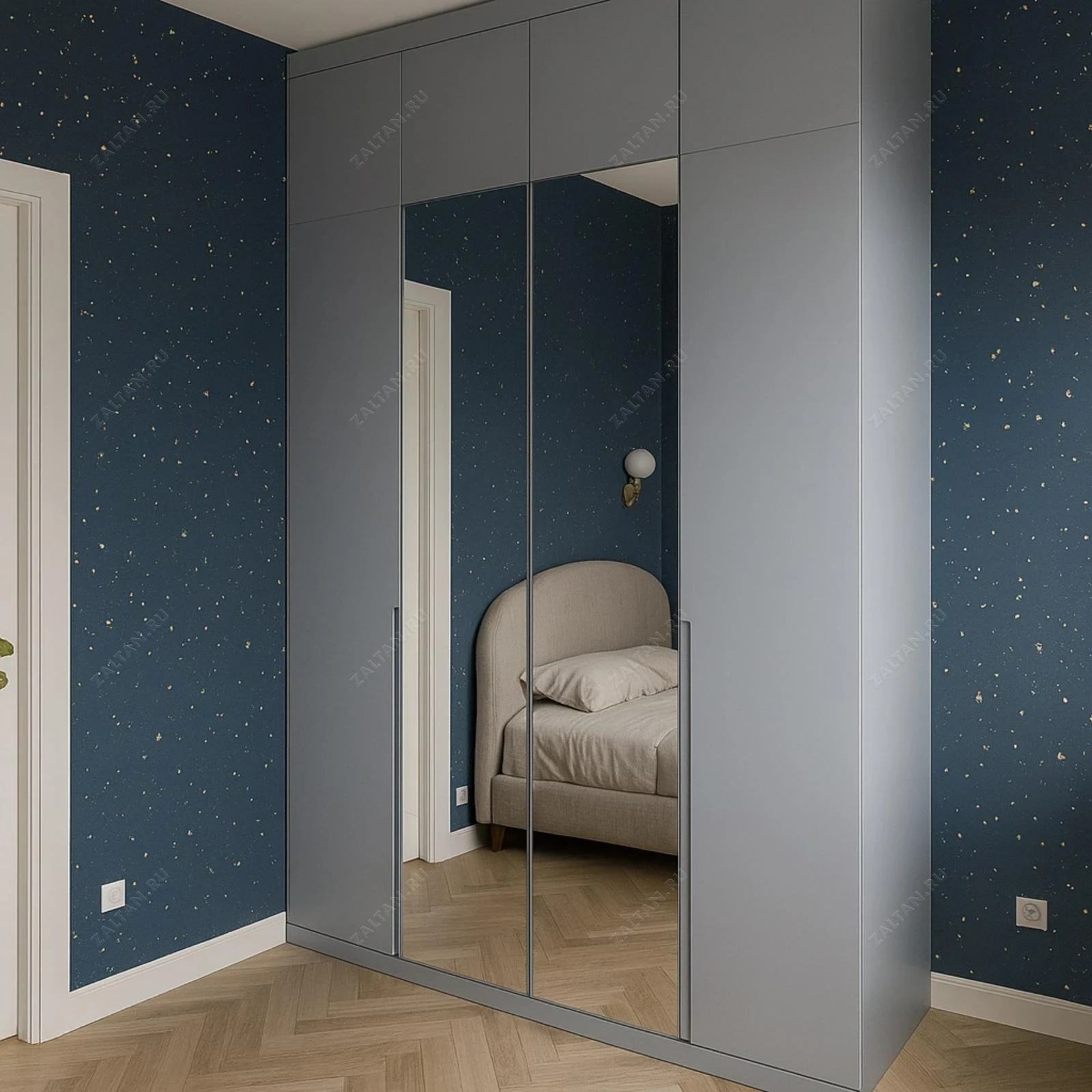 Элегантный корпусный шкаф на заказ — решение для спальни в стиле минимализм. Фасады из МДФ в матовом сером оттенке сочетаются с двумя центральными зеркальными полотнами, визуально расширяющими пространство. Интегрированные вертикальные ручки, доводчики на дверях и продуманная внутренняя планировка: полки, штанга и ящики под заказ.