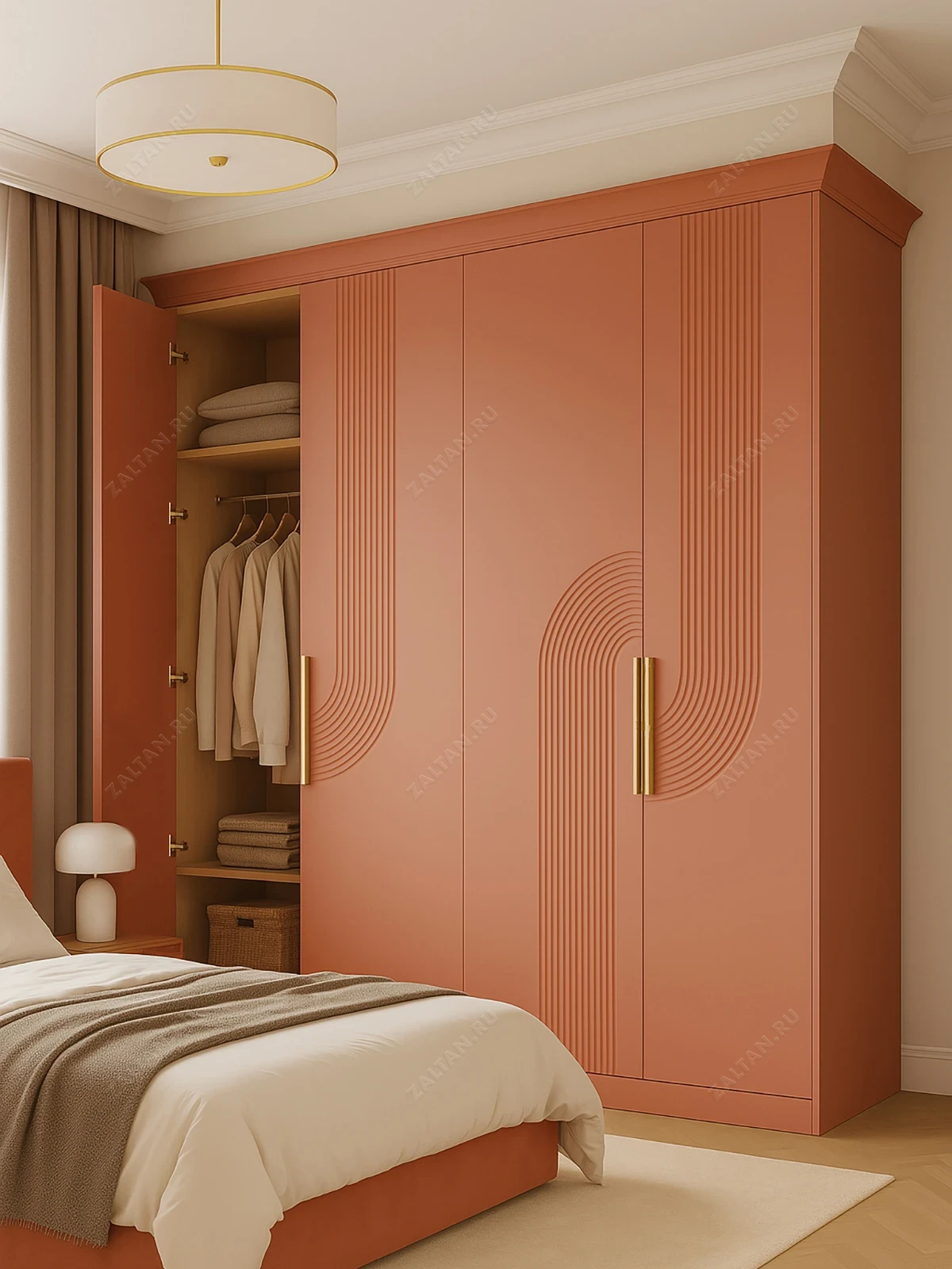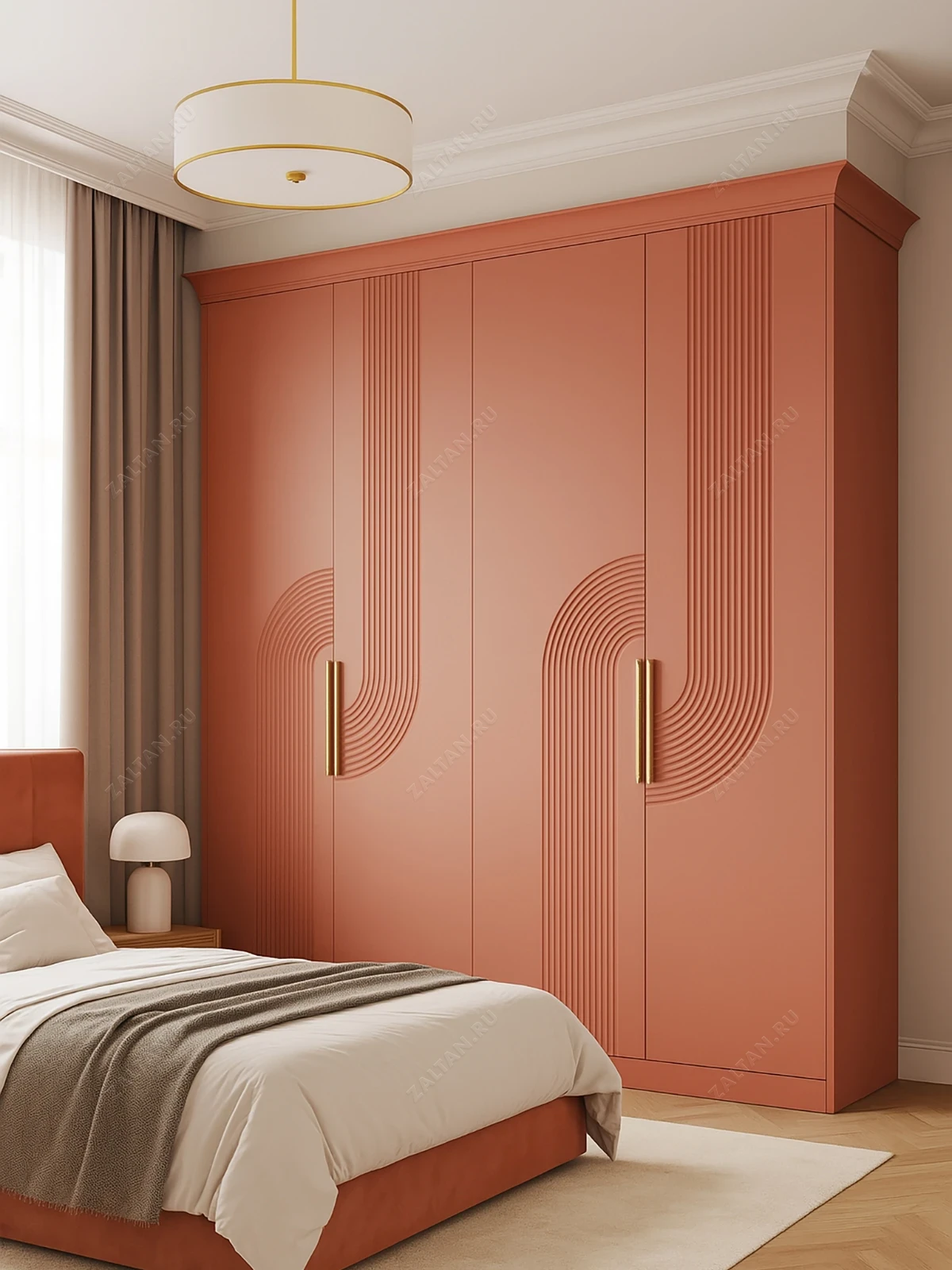 Корпусный шкаф «Линц» — яркий акцент в спальне. Гладкие фасады с геометрической фрезеровкой создают оригинальный стиль. Тёплый коралловый цвет делает интерьер уютным и современным. Шкаф сочетает эстетику и вместимость.