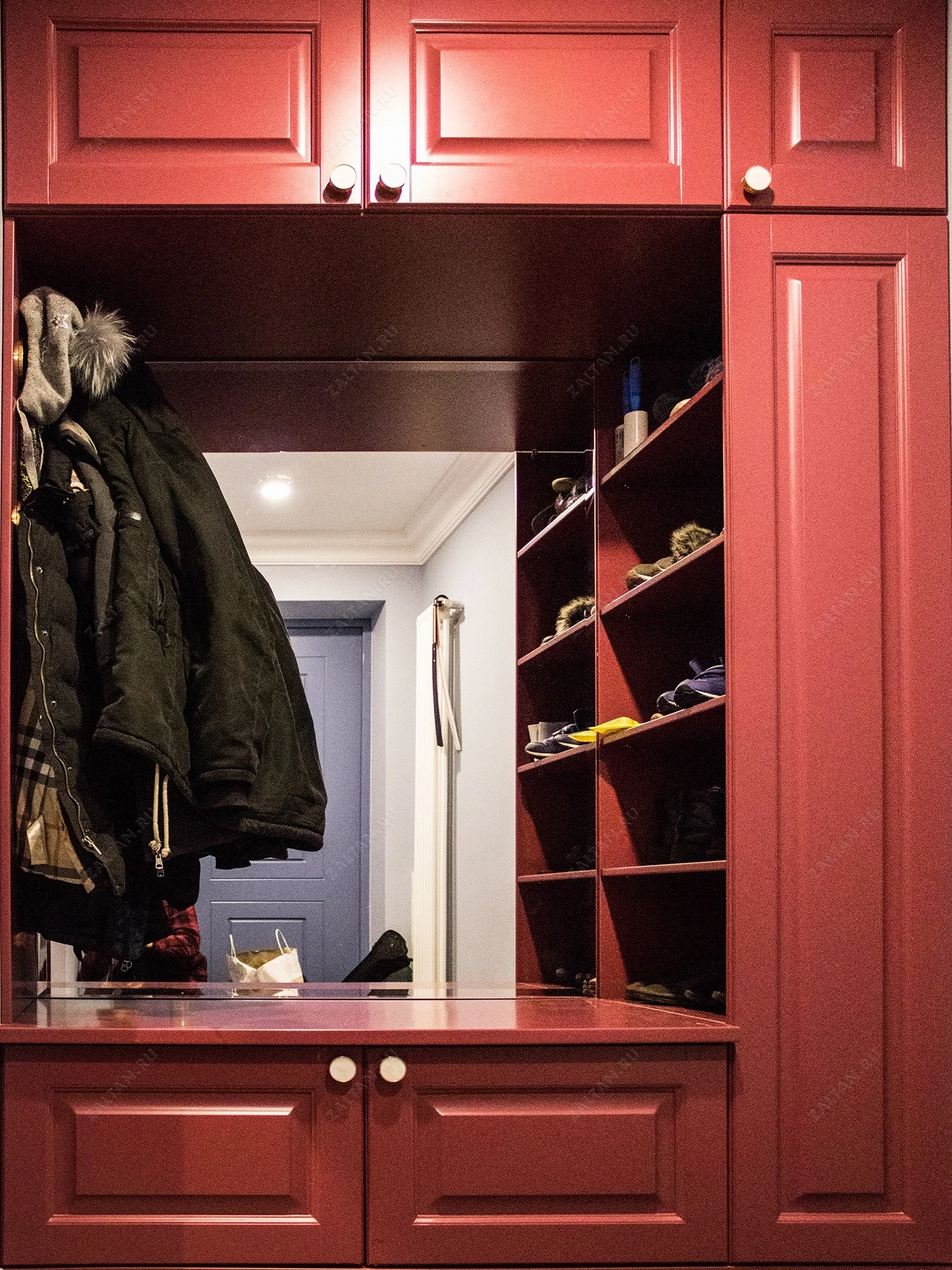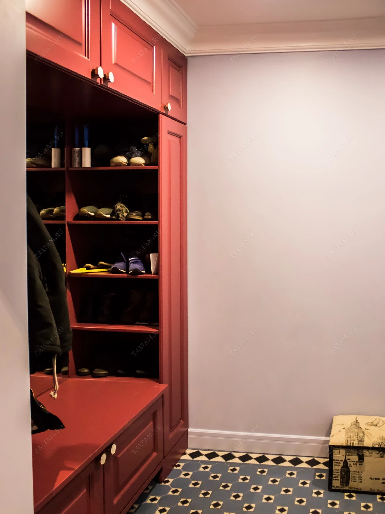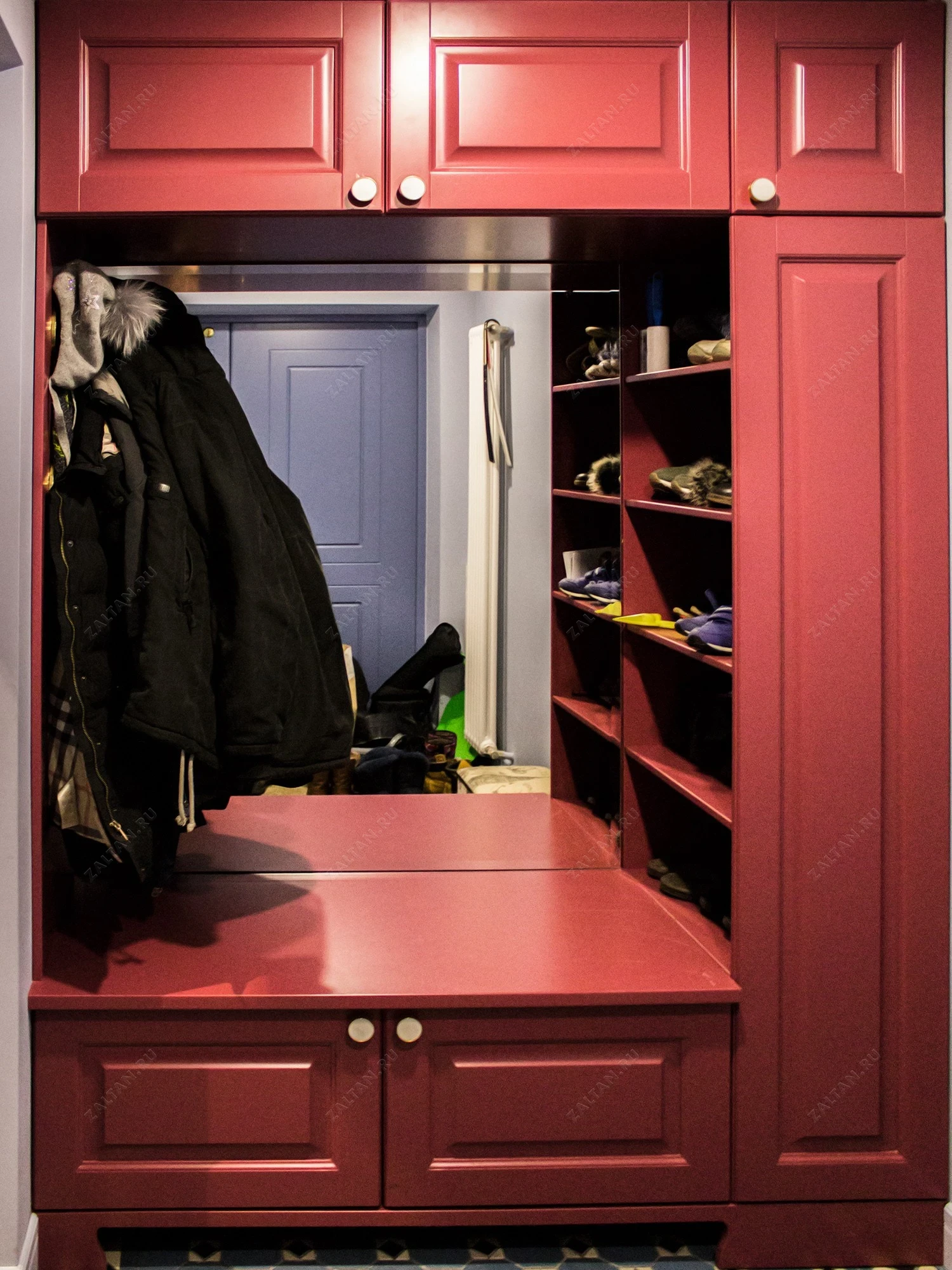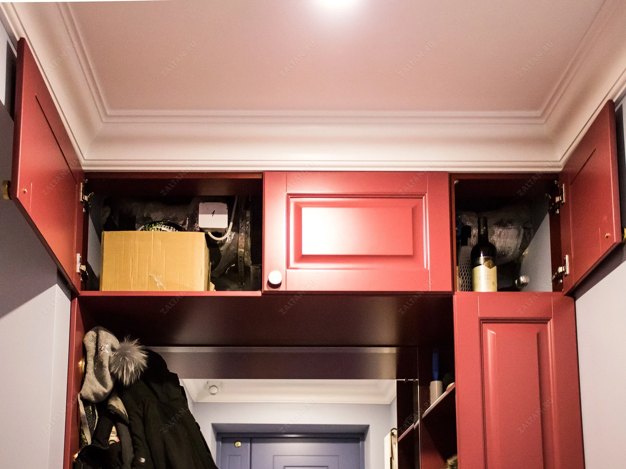 Стильная прихожая Элгин от компании ZALTAN сочетает в себе классическую элегантность и практичность. Основной акцент прихожей — насыщенный красный цвет с эмалевым покрытием, придающий глубину и яркость интерьеру. Фрезерованные распашные двери из МДФ подчеркивают традиционный стиль и придают дизайну особую изысканность.
