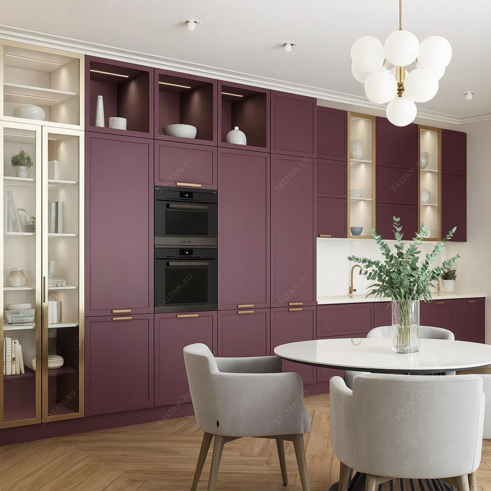 Индивидуально изготовленная кухня в неоклассическом стиле с матовыми фасадами и декоративными витринами в золотом профиле. Решение для тех, кто ценит премиальное качество и продуманную эргономику.