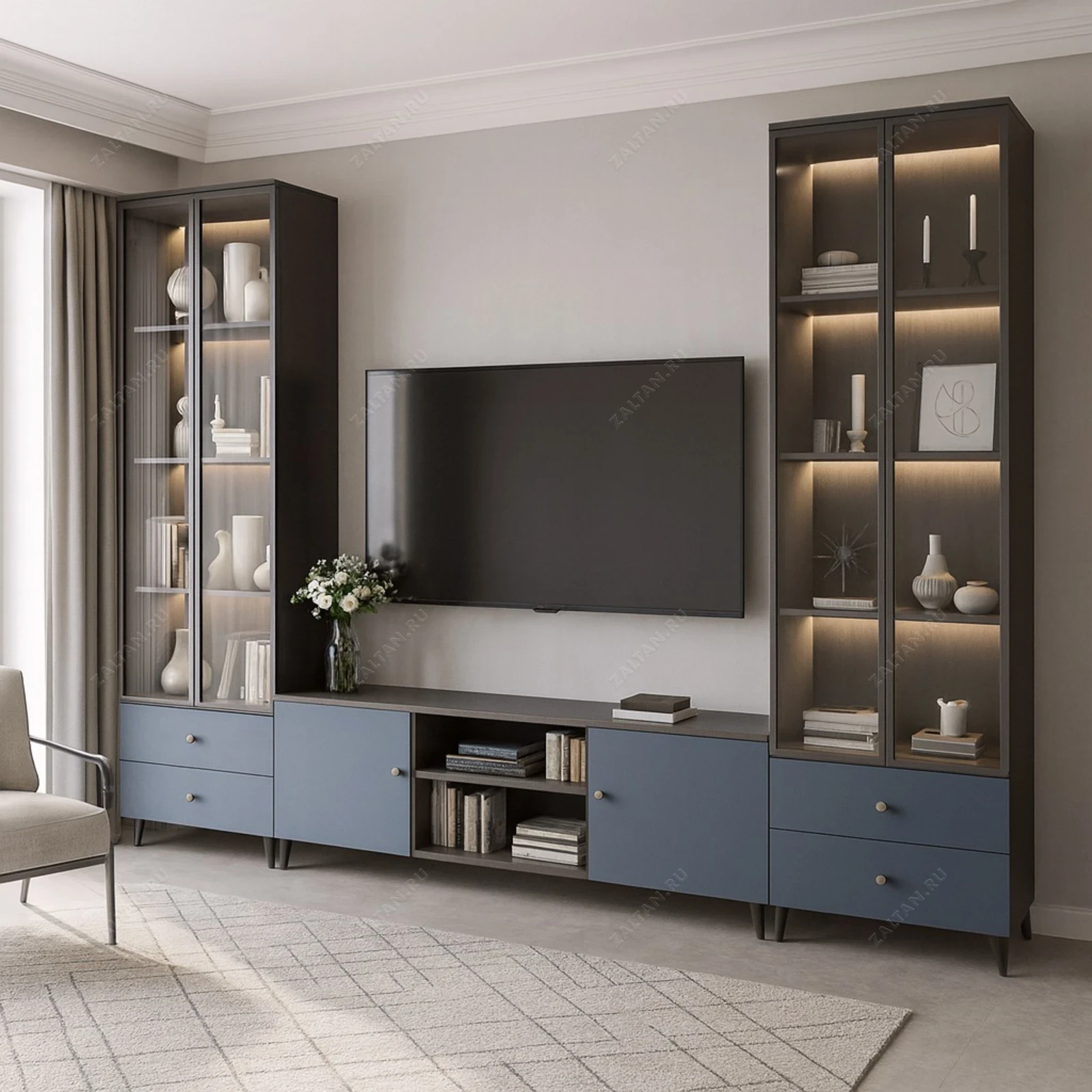 Элегантная модульная стенка для гостиной: сочетание тёмного каркаса и матовых синих фасадов, скруглённых ножек и витрин со стеклом. Подходит для демонстрации декора и размещения ТВ. Изготовим по вашим размерам с выбором материалов и подсветки.