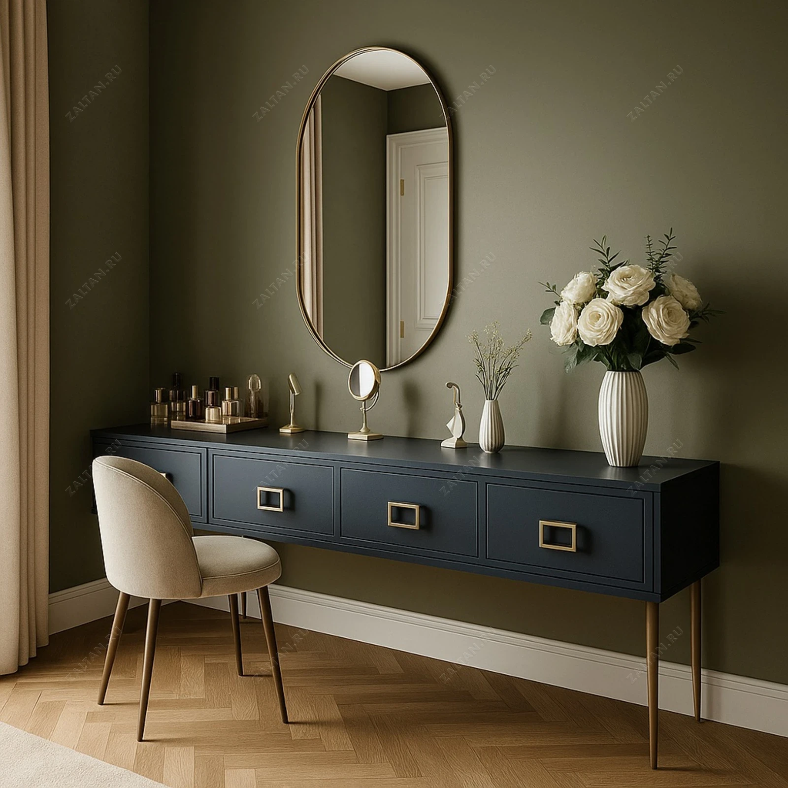 Элегантная настенная консоль — премиальный предмет мебели для прихожей, спальни или гостиной. Компактная и функциональная конструкция с тремя выдвижными ящиками, тонкими металлическими ножками и декоративными квадратными ручками.