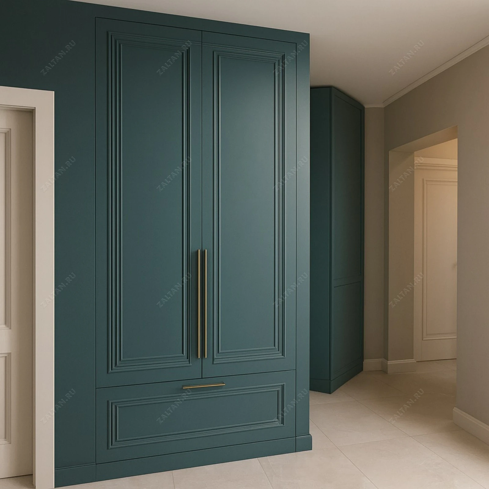 Элегантный встроенный шкаф в неоклассическом ключе, выполнен по индивидуальным размерам. Корпус и фасады из МДФ с эмалью матового тона, декоративные фрезерованные панели и длинные латунные ручки подчёркивают премиальный характер изделия.