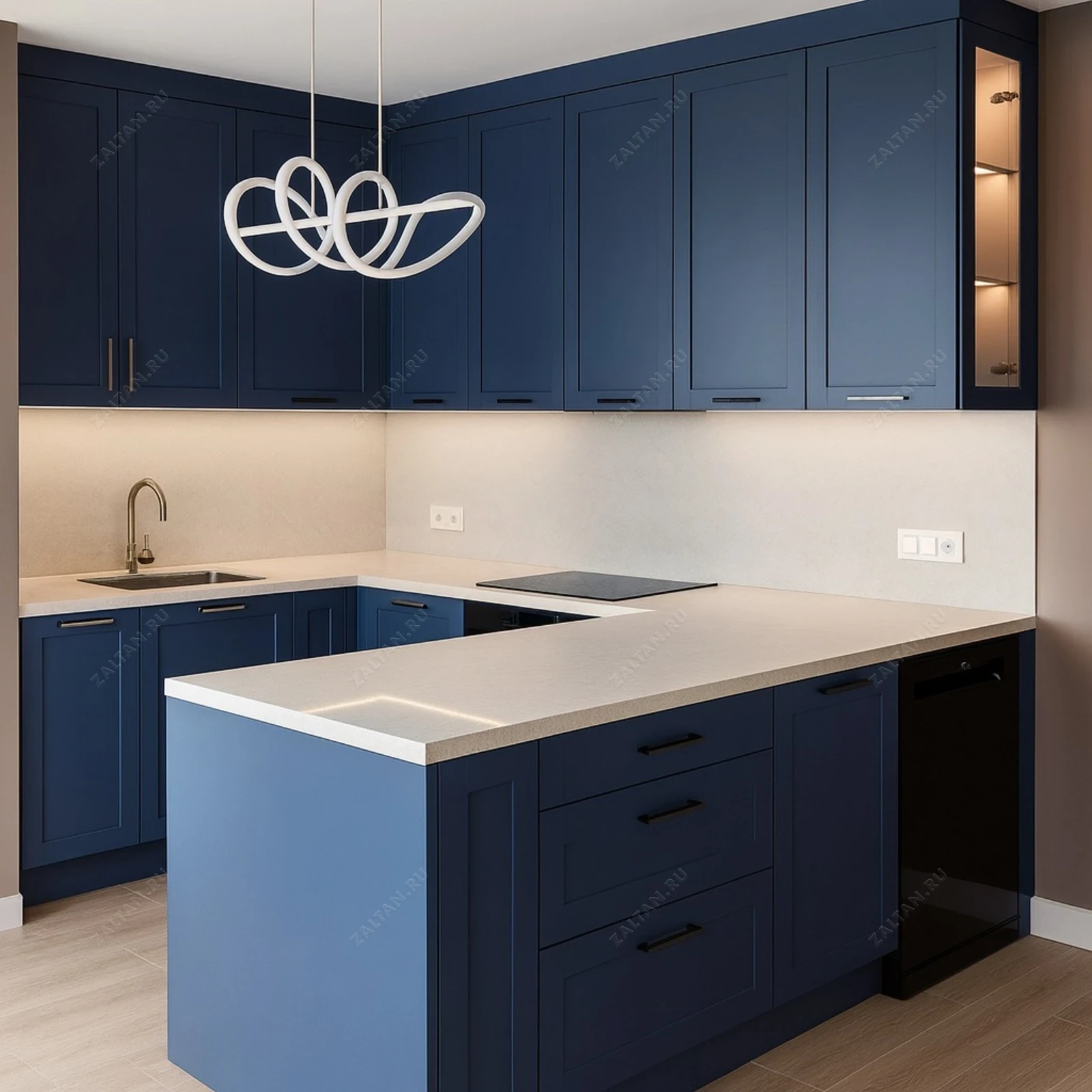 Эта индивидуальная кухня выполнена в глубоком синем цвете с матовыми фасадами в стиле современная классика. Продуманная П-образная планировка с островом даёт удобную рабочую поверхность и место для хранения.