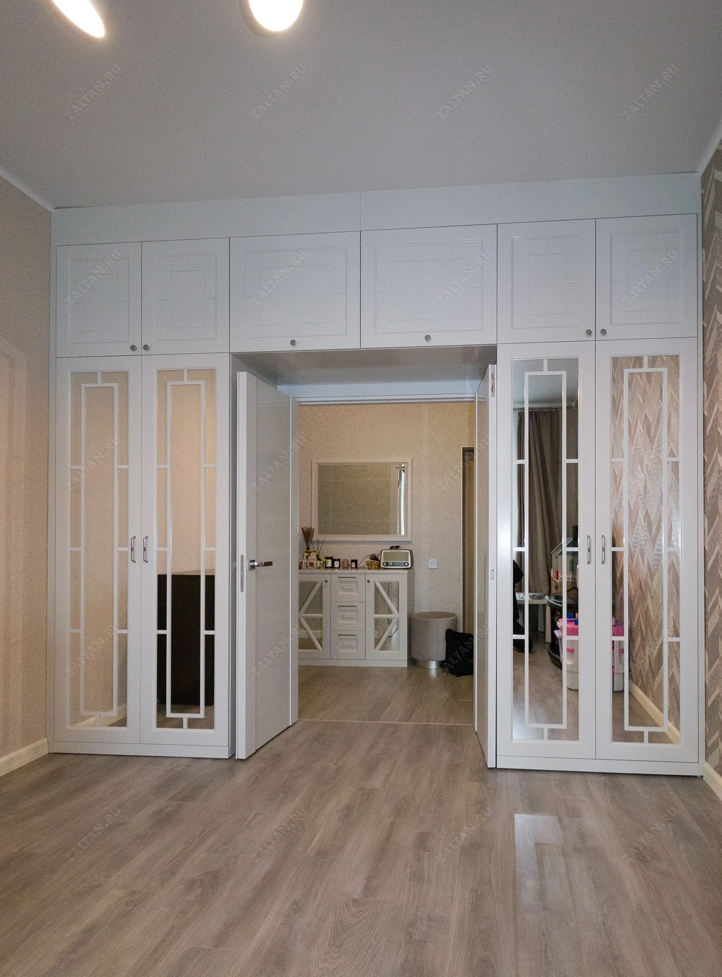 П-образный шкаф Вермонт является изящным и практичным решением для гостиной, выполнен в стиле неоклассика. Он идеально встроен над дверным проемом в форме буквы П, оснащен антресольным рядом и зеркальными дверями с декоративной раскладкой, окрашенными в белый цвет эмалью.