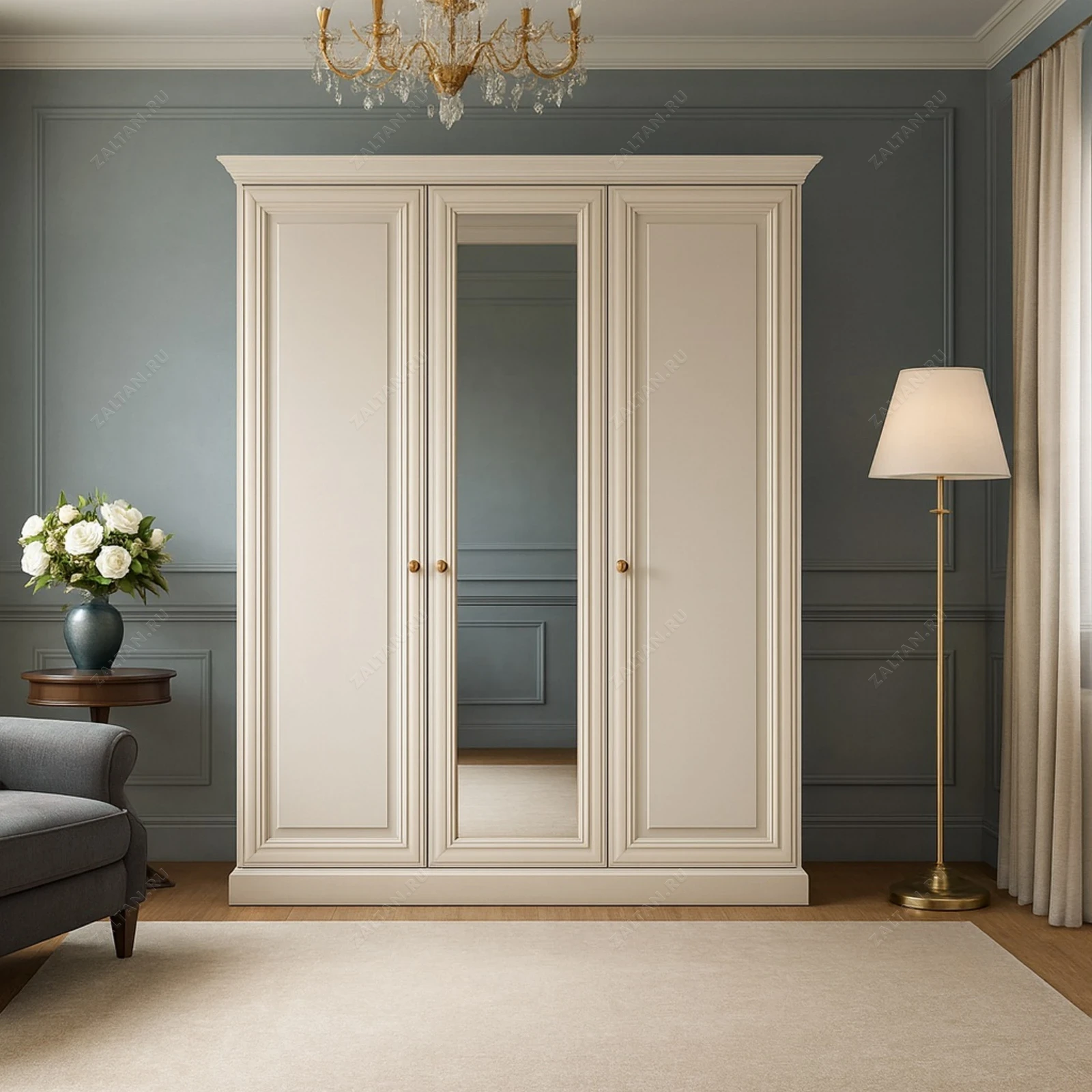 Классический трёхдверный платяной шкаф премиум-класса с центральной зеркальной дверью. Корпус и фасады — окрашенный МДФ с декоративной рамой и карнизом, металлические ручки в тёплом золотистом тоне, высокий цоколь. Пропорции и молдинги выдержаны в неоклассическом стиле.
