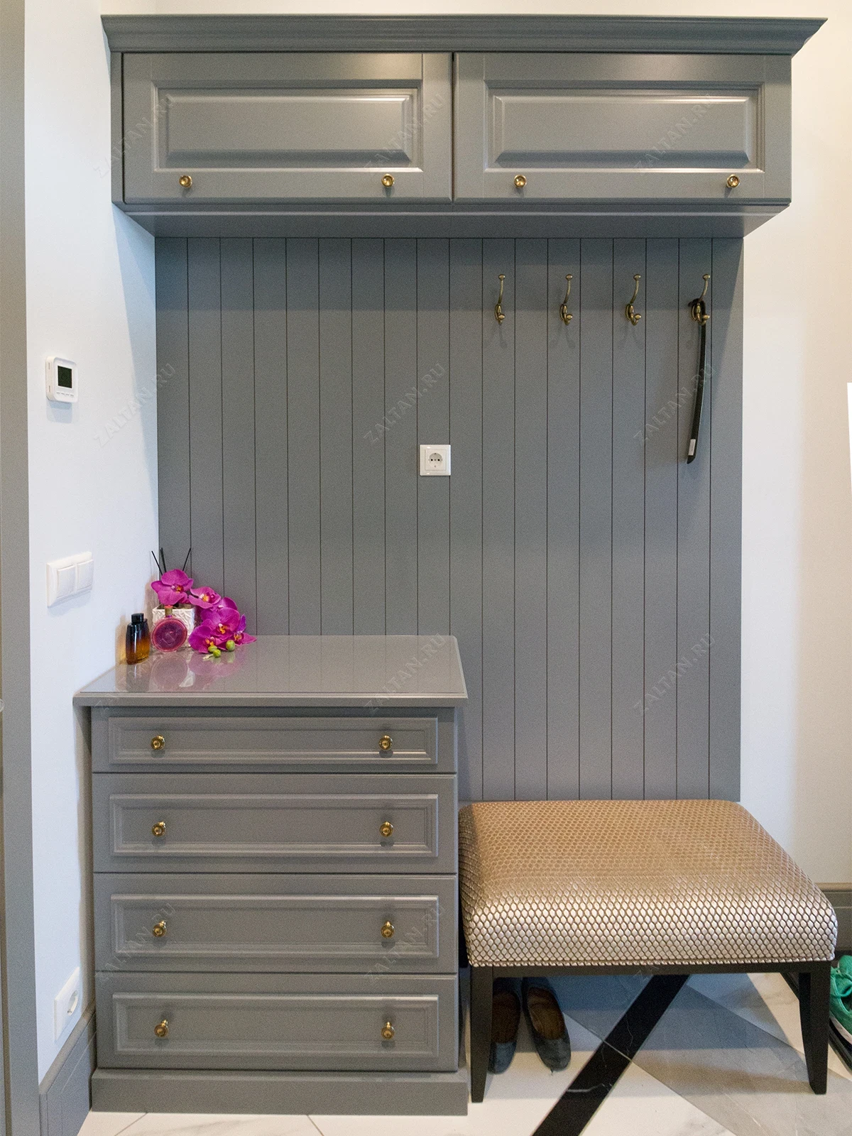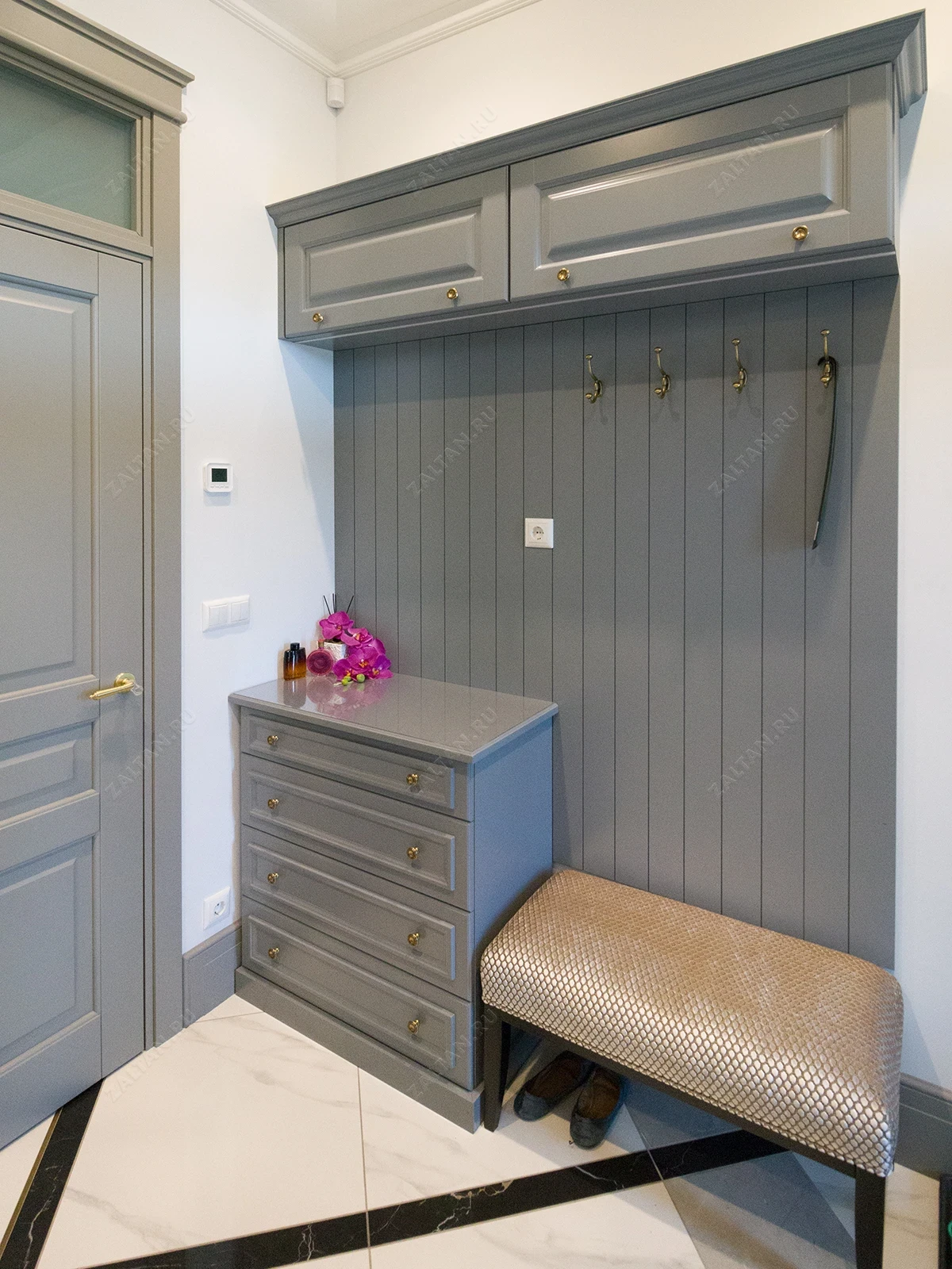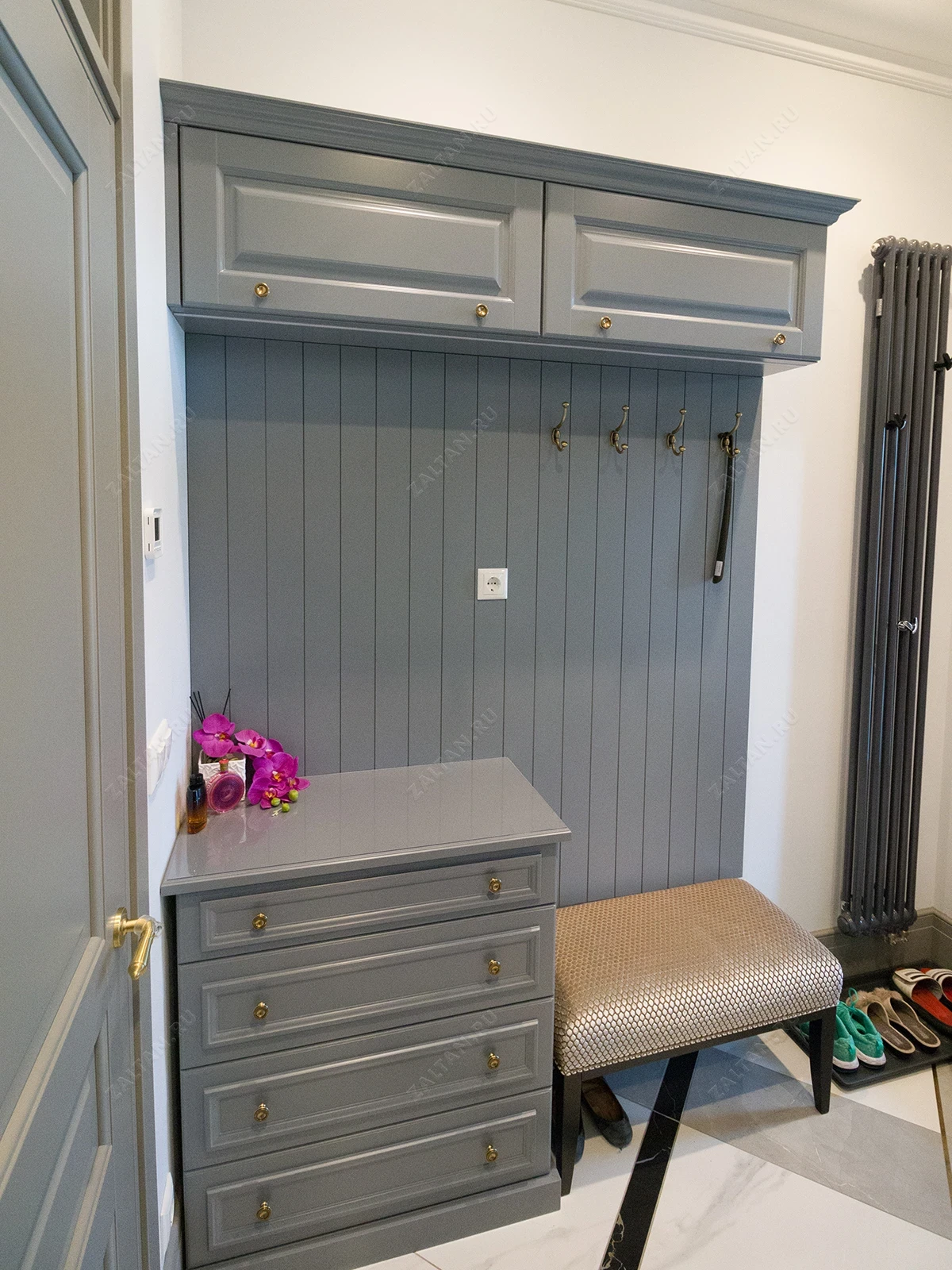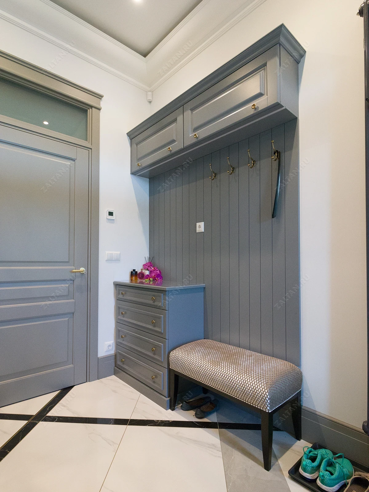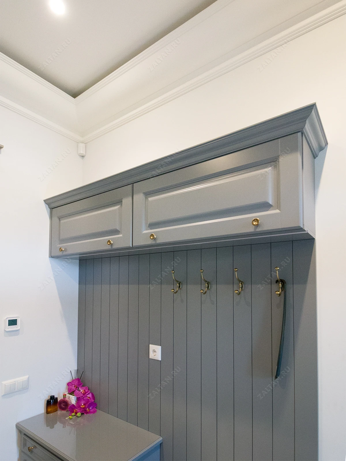 В коридор была изготовлена узкая небольшая прихожая в классическом стиле в эмали. Состоит из стеновой панели с реечной фрезеровкой, антресольного ряда с подъемными дверцами, комода с 4-мя ящиками и банкетки (банкетка заказчика). Изготовлена мебель из МДФ и окрашена в серый цвет. Открытая зона с крючками под верхнюю одежду, в комоде предполагается хранение обвуи.
