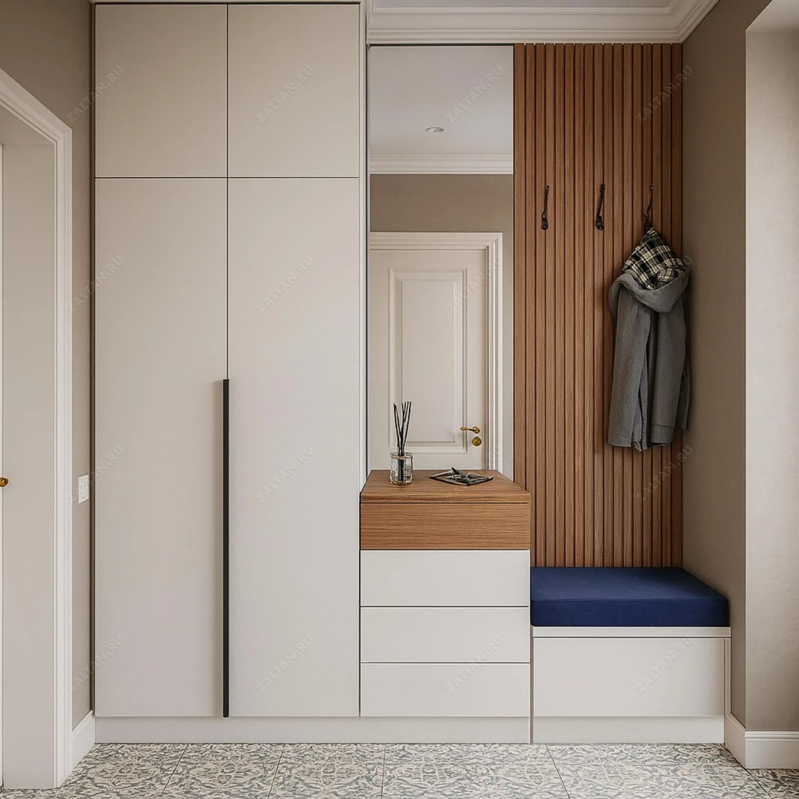 Модульная прихожая премиум-класса, созданная под индивидуальные размеры. Комбинация лаконичных матовых фасадов и реечного шпонированного панно создаёт тёплую, современную атмосферу.