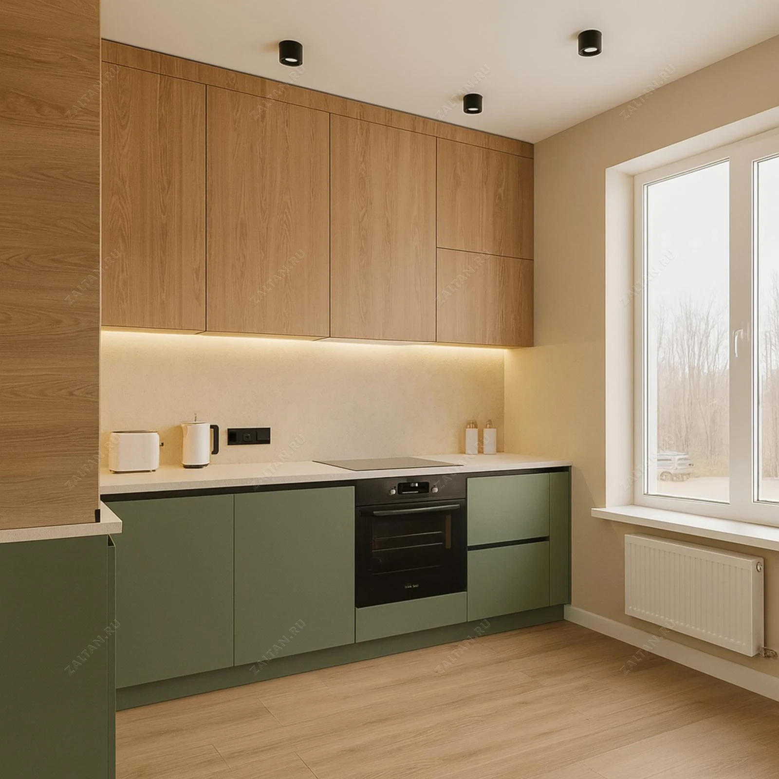 Индивидуальная угловая кухня премиум-класса: верхние фасады — тёплый древесный шпон, нижние — матовая зелёная МДФ. Компактное решение с встроенной техникой, без видимых ручек и с интегрированной подсветкой рабочей зоны.
