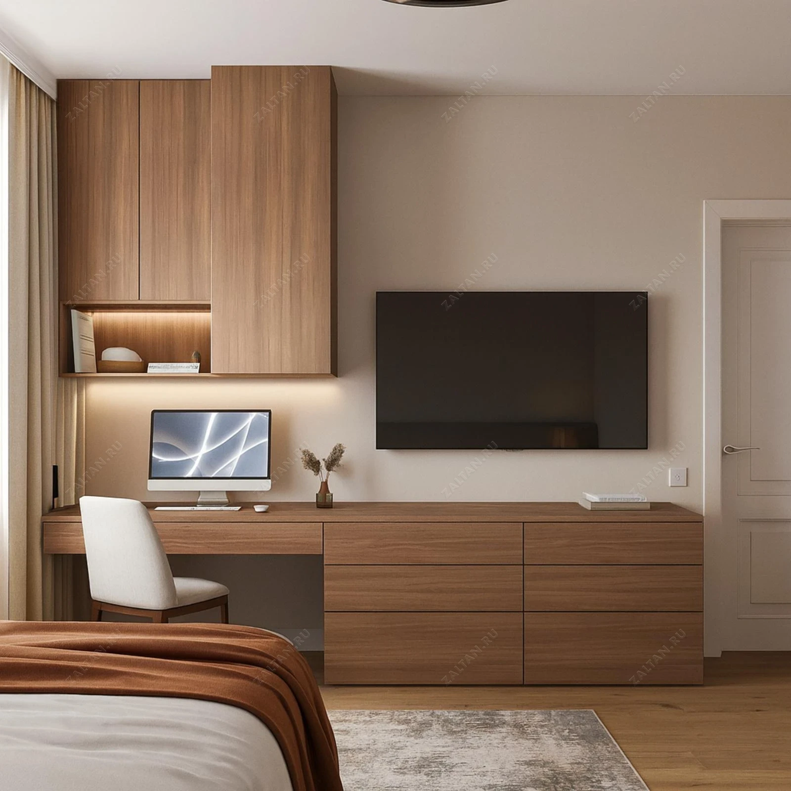 Элегантная модульная рабочая зона с комодом и навесными шкафами из дубового шпона. Идеальное решение для спальни или компактного кабинета: сочетание минимализма, тёплого оттенка дерева и аккуратных линейных фасадов.