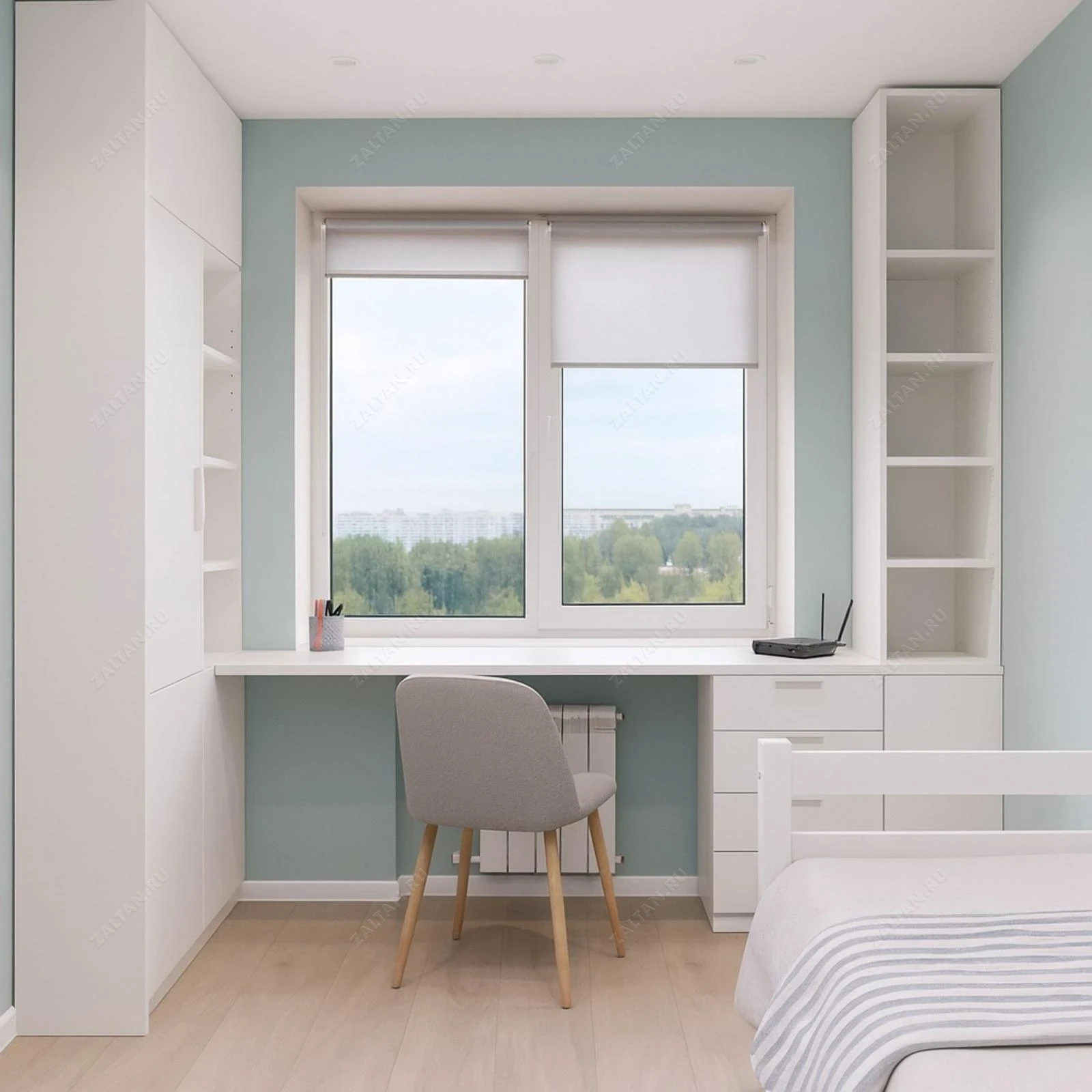 Индивидуальная рабочая зона, встроенная вокруг окна — комбинированное решение для спальни или детской. Выполнена в белом матовом оттенке, включает столешницу, высокий шкаф-пенал, открытые полки и комплект ящиков.